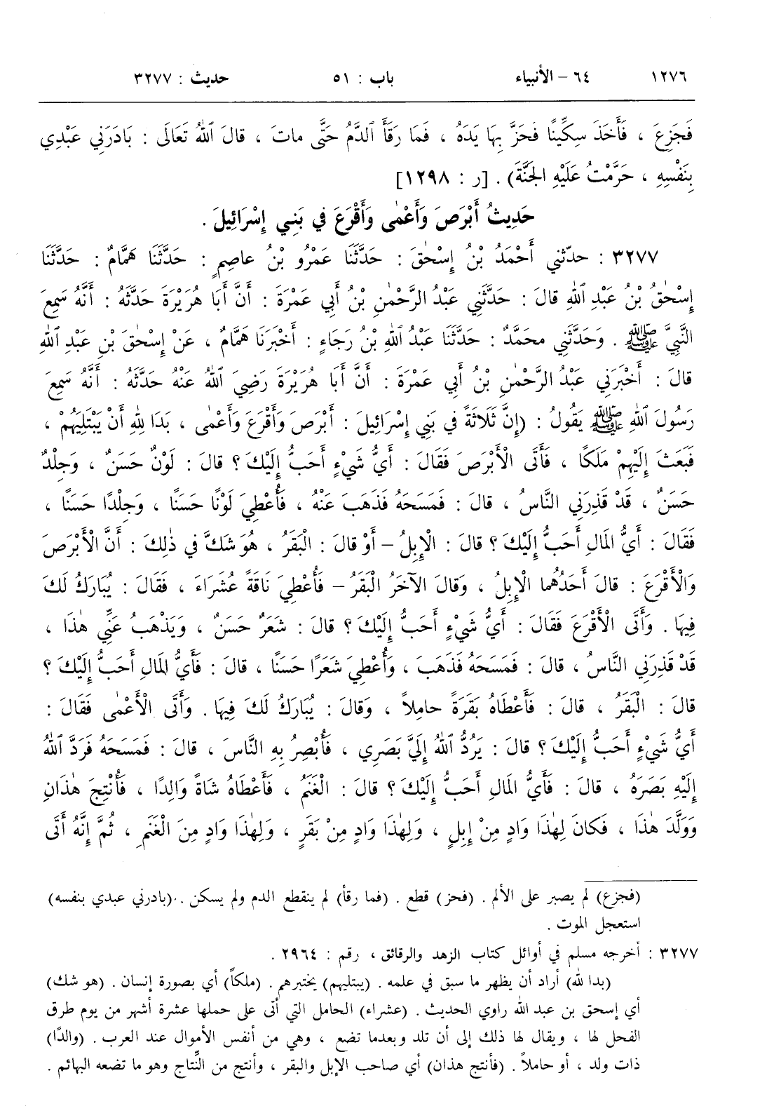 : أنه سمع رسول الله صلى الله عليه و سلم يقول ( إن ثلاثة في بني إسرائيل أبرص وأقرع وأعمى بدا لله أن يبتليهم فبعث إليهم ملكا فأتى الأبرص فقال أي شيء أحب إليك ؟ قال لون حسن وجلد حسن قد قذرني الناس قال فمسحه فذهب عنه فأعطي لونا حسنا وجلدا حسنا فقال أي المال أحب إليك ؟ قال الإبل - أو قال البقر هو شك في ذلك أن الأبرص والأقرع قال أحدهما الإبل وقال الأخر البقر - فأعطي ناقة عشراء فقال يبارك لك فيها . وأتى الأقرع فقال أي شيء أحب إليك ؟ قال شعر حسن ويذهب عني هذا قد قذرني الناس قال فمسحه فذهب وأعطي شعرا حسنا قال فأي المال أحب إليك ؟ قال البقر قال فأعطاه بقرة حاملا وقال يبارك لك فيها . وأتى الأعمى فقال أي شيء أحب إليك ؟ قال يرد الله إلي بصري فأبصر به الناس قال فمسحه فرد الله إليه بصره قال فأي المال أحب إليك ؟ قال الغنم فأعطاه شاة والدا فأنتج هذان وولد هذا فكان لهذا واد من إبل ولهذا واد من بقر ولهذا واد من غنم ثم إنه أتى الأبرص في صورته وهيئته فقال رجل مسكين تقطعت