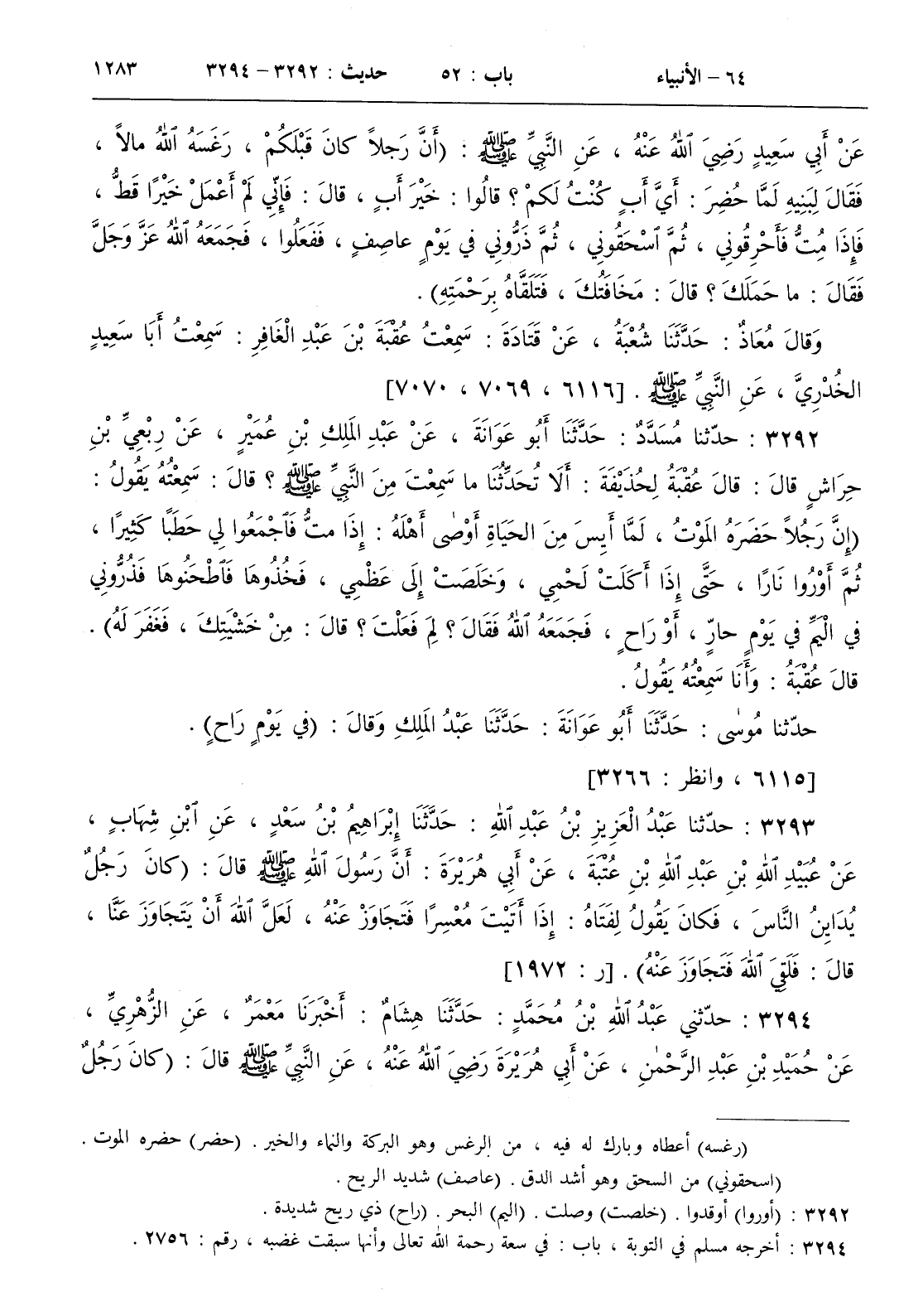 : عن النبي صلى الله عليه و سلم قال ( كان رجل يسرف على نفسه فلما حضره الموت قال لبنيه إذ أنا مت فأحرقوني ثم اطحنوني ثم ذروني في الريح فوالله لئن قدر علي ربي ليعذبني عذابا ما عذبه أحد فلما مات فعل به ذلك فأمر الله الأرض فقال اجمعي ما فيك منه ففعلت فإذا هو قائم فقال ما حملك على ما صنعت ؟ قال يا رب خشيتك فغفر له ) . وقال غيره ( مخافتك يا رب )