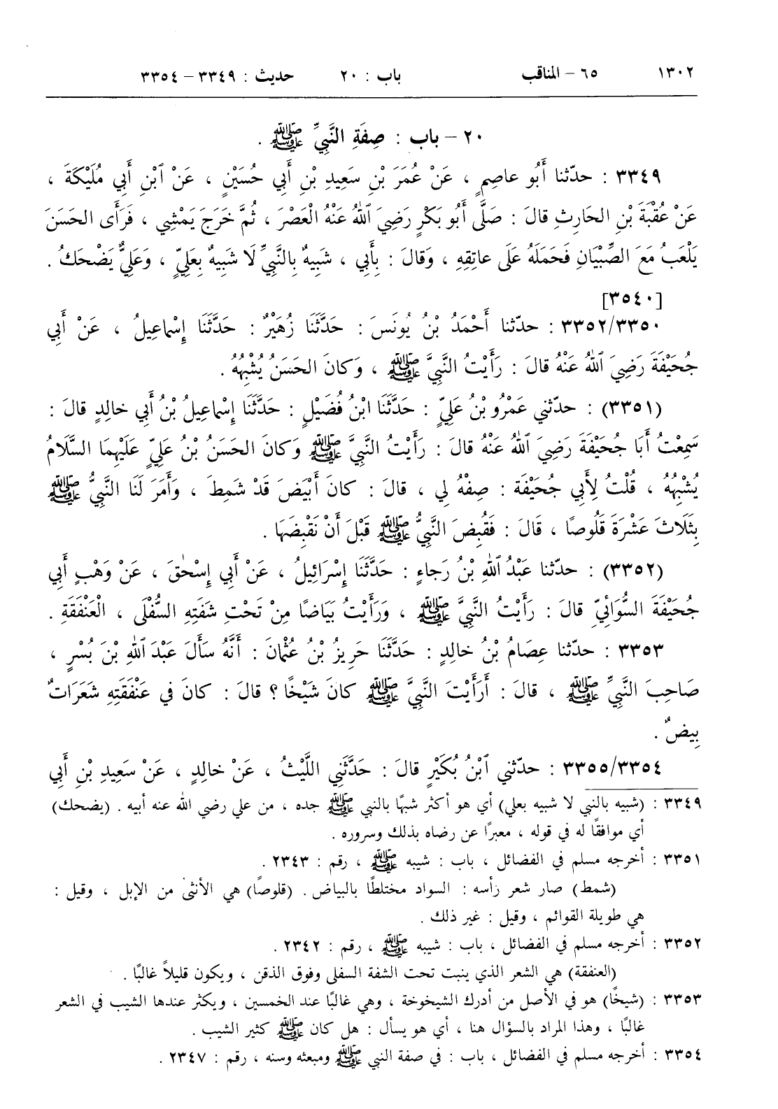 : سمعت أنس بن مالك يصف النبي صلى الله عليه و سلم قال كان ربعة من القوم ليس بالطويل ولا بالقصير أزهر اللون ليس بأبيض أمهق ولا آدم ليس بجعد قطط ولا سبط رجل أنزل عليه وهو ابن أربعين فلبث بمكة عشر سنين ينزل عليه وبالمدينة عشر سنين وقبض وليس في رأسه ولحيته عشرون شعرة بيضاء