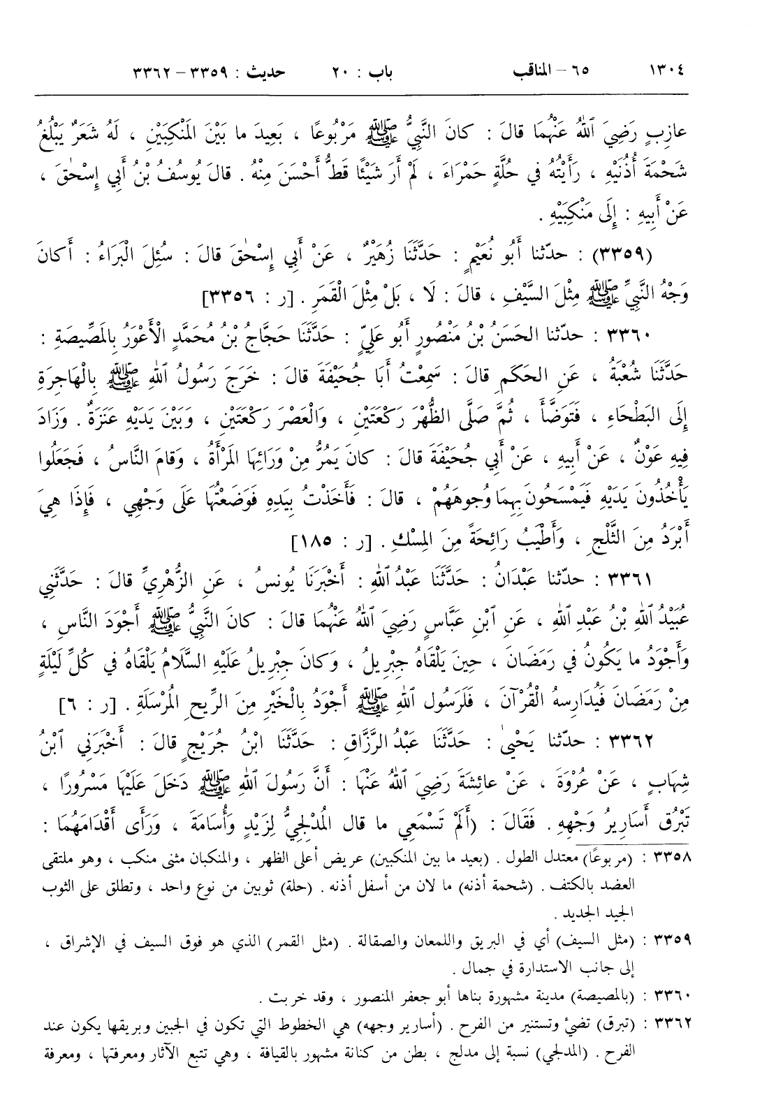 : خرج رسول الله صلى الله عليه و سلم بالهاجرة إلى البطحاء فتوضأ ثم صلى الظهر ركعتين والعصر ركعتين وبين يديه عنزة . وزاد فيه عون عن أبيه عن أبي جحيفة قال كان يمر من ورائها المرأة وقام الناس فجعلوا يأخذون يديه فيمسحون بهما وجوههم قال فأخذت بيده فوضعتها على وجهي فإذا هي أبرد من الثلج وأطيب رائحة من المسك