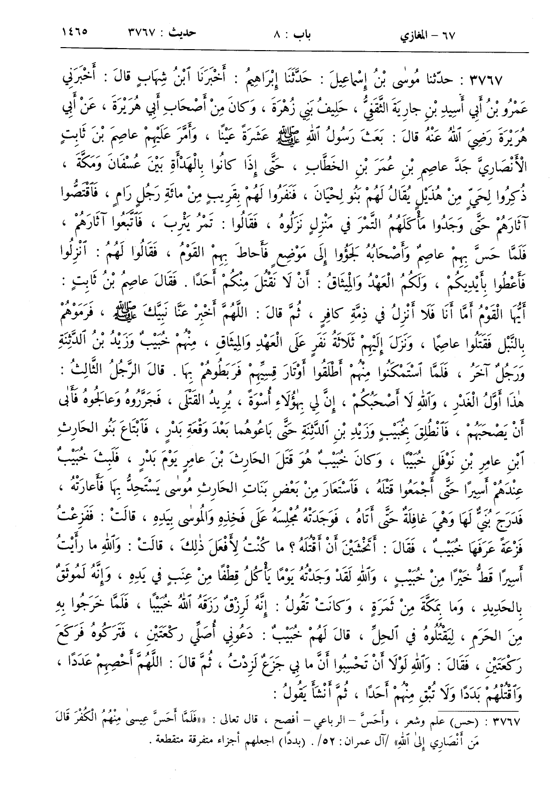 : بعث رسول الله صلى الله عليه و سلم عشرة عينا وأمر عليهم عاصم ابن ثابت الأنصاري جد عاصم بن عمر بن الخطاب حتى إذا كانوا بالهدأة بين عسفان ومكة ذكروا لحي من هذيل يقال له بنو لحيان فنفروا لهم بقريب مائة رجل رام فاقتصوا آثارهم حتى وجدوا مأكلهم التمر في منزل نزلوه فقالوا تمر يثرب فاتبعوا آثارهم فلما حس بهم عاصم وأصحابه لجؤوا إلى موضع فأحاط بهم القوم فقالوا لهم انزلوا فأعطوا بأيديكم ولكم العهد والميثاق أن لا نقتل منكم أحدا . فقال عاصم بن ثابت أيها القوم أما أنا فلا أنزل في ذمة كافر ثم قال اللهم أخبر عنا نبيك صلى الله عليه و سلم فرموه بالنبل فقتلوا عاصما ونزل ثلاثة نفر على العهد والميثاق منهم خبيب وزيد بن الدثنة ورجل آخر فلما استمكنوا منهم أطلقوا أوتار قسيهم فربطوهم بها . قال الرجل الثالث هذا أول الغدر والله لا أصحبكم