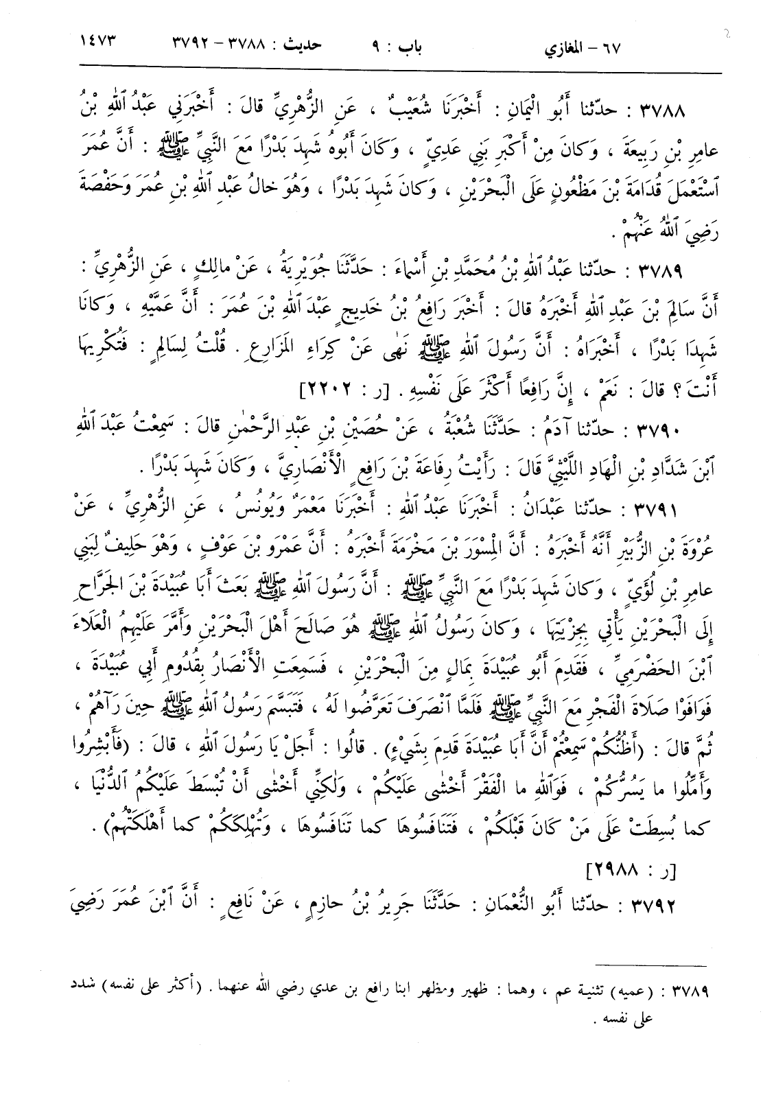 3788 - حدثنا أبو اليمان أخبرنا شعيب عن الزهري قال أخبرني عبد الله بن عامر بن ربيعة وكان من أكبر بني عدي وكان أبوه شهد بدرا مع النبي صلى الله عليه و سلم