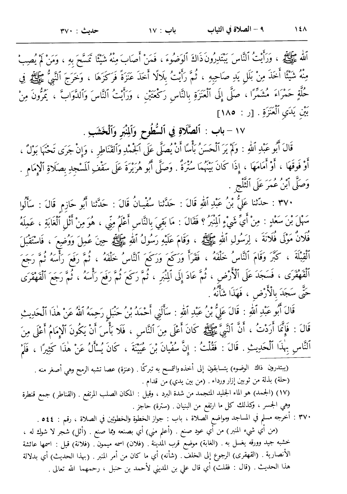 قال أبو عبد الله قال علي بن عبد الله سألني أحمد بن حنبل رحمه الله عن هذا الحديث قال فإنما أردت أن النبي صلى الله عليه و سلم كان أعلى من الناس فلا بأس أن يكون الإمام أعلى من الناس بهذا الحديث . قال فقلت إن سفيان بن عيينة كان يسأل عن هذا كثيرا فلم تسمعه منه ؟ قال لا