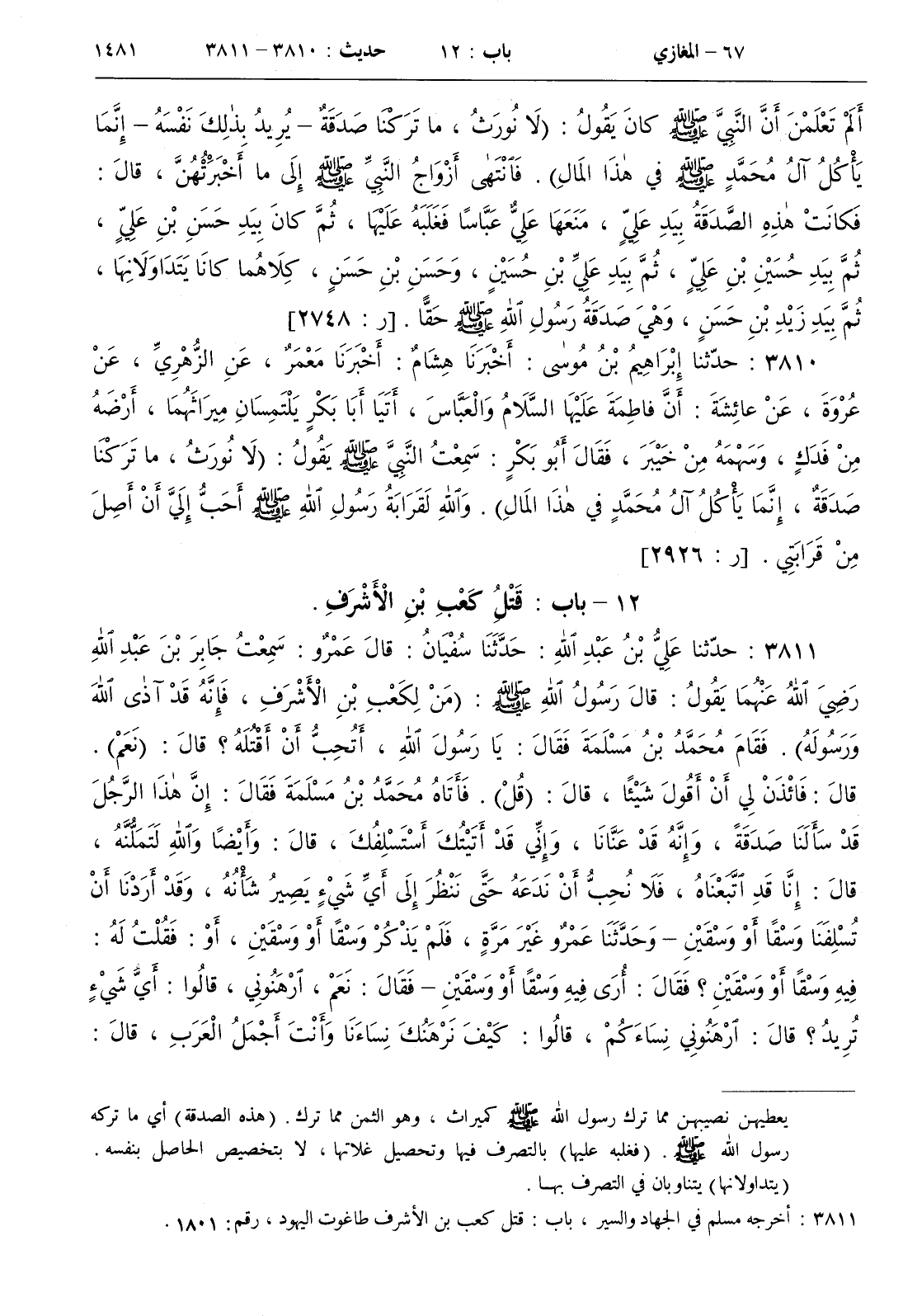 : قال رسول الله صلى الله عليه و سلم ( من لكعب بن الأشرف فإنه قد آذى الله ورسوله ) . فقام محمد بن مسلمة فقال يا رسول الله أتحب أن أقتله ؟ قال ( نعم ) . قال فائذن لي أن أقول شيئا قال ( قل ) فأتاه محمد بن مسلمة فقال إن هذا الرجل قد سألنا صدقة وإنه قد عنانا وإني قد أتيتك أستسلفك قال وأيضا والله لتملنه قال إنا قد اتبعناه فلا نحب أن ندعه حتى ننظر إلى أي شيء يصير شأنه وقد أردنا أن تسلفنا وسقا أو وسقين ؟ - وحدثنا عمرو غير مرة فلم يذكر وسقا أو وسقين أو فقلت له فيه وسقا أو وسقين ؟ فقال أرى فيه وسقا أو وسقين - فقال نعم ارهنوني قالو أي شيء تريد ؟ قال أرهنوني نساءكم قالوا كيف نرهنك نساءنا وأنت أجمل العرب قال فارهنوني أبناءكم قالوا كيف نرهنك أبناءنا فيسب أحدهم فيقال رهن بوسق أو وسقين هذا عار علينا وكنا نرهنك اللأمة - قال سفيان يعني السلاح - فواعده أن يأتيه فجاءه ليلا ومعه أبو نائلة وهو أخو كعب من الرضاعة فدعاهم إلى الحصن فنزل إليهم فقالت له امرأته أين تخرج هذه الساعة ؟ فقال إنما هو محمد بن مسلمة وأخي أبو نائلة وقال غيرعمرو قالت أسمع صوتا كأنه يقطر منه الدم قال إنما هو أخي محمد بن مسلمة ورضيعي أبو نائلة إن الكريم لو دعي إلى طعنة بليل لأجاب . قال ويدخل محمد بن مسلمة معه رجلين - قيل لسفيان سماهم عمرو ؟ قال سمى بعضهم - قال عمرو جاء معه برجلين وقال غير عمرو أبو عبس بن جبر والحارث بن أوس وعباد بن بشر . قال عمرو جاء معه برجلين فقال إذا ما جاء فإني قائل بشعره فأشمه فإذا رأيتموني استمكنت من رأسه فدونكم فاضربوه . وقال مرة ثم أشمكم فنزل إليهم متوشحا وهو ينفح منه ريح الطيب فقال ما رأيت كاليوم ريحا أي أطيب وقال غير عمرو قال عندي أعطر نساء العرب وأكمل العرب . قال عمرو فقال أتأذن لي أن أشم رأسك ؟ قال نعم فشمه ثم أشم أصحابه ثم قال أتأذن لي ؟ قال نعم فلما استمكن منه قال دونكم فقتلوه ثم أتوا النبي صلى الله عليه و سلم فأخبروه