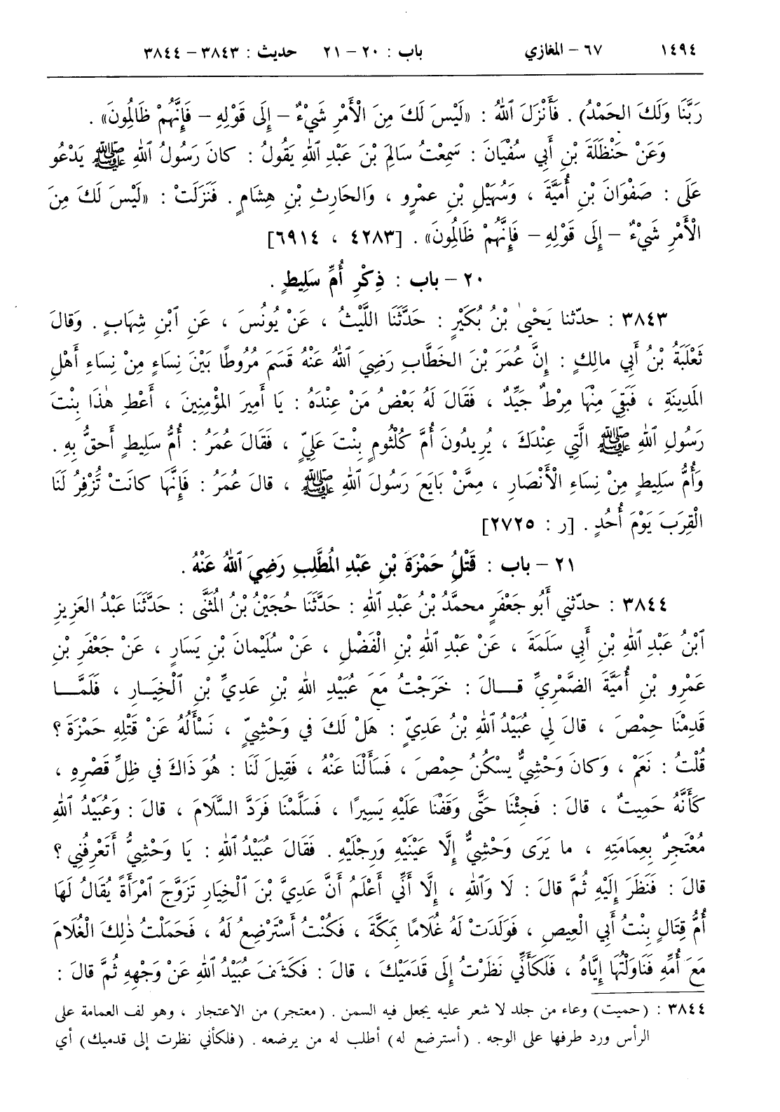 : خرجت مع عبيد الله بن عدي بن الخيار فلما قدمنا حمص قال لي عبيد الله بن عدي هل لك في وحشي نسأله عن قتله حمزة ؟ قلت نعم وكان وحشي يسكن حمص فسألنا عنه فقيل لنا هو ذاك في ظل قصره كأنه حميت قال فجئنا حتى وقفنا عليه يسيرا فسلمنا فرد السلام قال عبيد الله معتجر بعمامته ما يرى وحشي إلا عينيه ورجليه . فقال عبيد الله يا وحشي أتعرفني ؟ قال فنظر إليه ثم قال لا والله إلا أني أعلم أن عدي بن الخيار تزوج امرأة يقال لها أم قتال بنت أبي العيص فولدت له غلاما بمكة فكنت أسترضع له فحملت ذلك الغلام مع أمه فناولتها إياه فلك - أني نظرت إلى قدميك قال فكشف عبيد الله عن وجهه ثم قال ألا تخبرنا بقتل حمزة ؟ قال نعم إن حمزة قتل طعيمة بن عدي بن الخيار ببدر فقال لي مولاي جبير بن مطعم إن قتلت حمزة بعمي فأنت حر قال فلما أن خرج الناس عام عينين وعينين جبل بحيال أحد بينه وبينه واد خرجت مع الناس إلى القتال فلما أن اصطفوا للقتال خرج سباع فقال هل من مبارز قال فخرج إليه حمزة بن عبد المطلب فقال يا سباع با ابن أم أنمار مقطعة البظور أتحاد الله ورسوله صلى الله عليه و سلم ؟ قال ثم أشد عليه فكان كأمس الذاهب قال وكمنت لحمزة تحت صخرة فلما دنا مني رميته بحربتي فأضعها في ثنته حتى خرجت من بين وركيه قال فكان ذاك العهد به فلما رجع الناس رجعت معهم فأقمت بمكة حتى فشا فيها الإسلام ثم خرجت إلى الطائف فأرسلوا إلى رسول الله صلى الله عليه و سلم رسولا فقيل لي إنه لا يهيج الرسل قال فخرجت معهم حتى قدمت على رسول الله صلى الله عليه و سلم فلما رآني قال ( آنت وحشي ) . قلت نعم قال ( أنت قتلت حمزة ) . قلت قد كان من الأمر ما بلغك قال ( فهل تستطيع أن تغيب وجهك عني ) . قال فخرجت فلما قبض رسول الله صلى الله عليه و سلم فخرج مسيلمة الكذاب قلت لأخرجن إلى مسيلمة لعلي أقتله فأكافئ به حمزة قال فخرجت مع الناس فكان من أمره ما كان قال فإذا رجل قائم في ثلمة جدار كأنه جمل أورق ثائر الرأس قال فرميته بحربتي فأضعها بين ثدييه حتى خرجت من بين كتفيه قال ووثب إليه رجل من الأنصار فضربه بالسيف على هامته