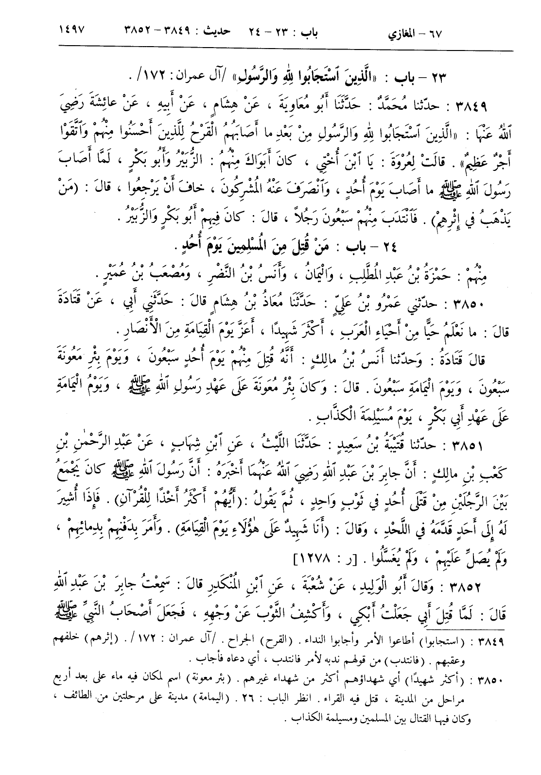 3851 - حدثنا قتيبة بن سعيد حدثنا الليث عن ابن شهاب عن عبد الرحمن بن كعب بن مالك أن جابر بن عبد الله رضي الله عنهما أخبره