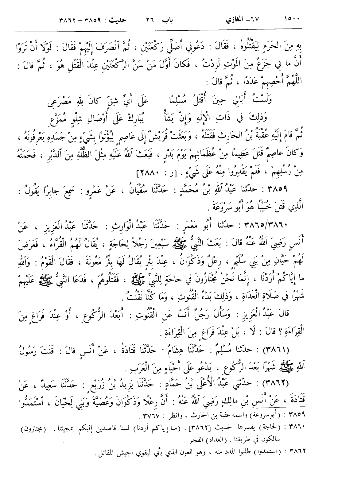 : أن رعلا وذكوان وعصية وبني لحيان استمدوا رسول الله صلى الله عليه و سلم على عدو فأمدهم بسبعين من الأنصار كنا نسميهم القراء في زمانهم كانوا يحتطبون بالنهار ويصلون بالليل حتى كانوا ببئر معونة قتلوهم وغدروا بهم فبلغ النبي صلى الله عليه و سلم فقنت شهرا يدعو في الصبح على أحياء من أحياء العرب على رعل وذكوان وعصية وبني لحيان قال أنس فقرأنا فيهم قرآنا ثم إن ذلك رفع بلغوا عنا قومنا أنا لقينا ربنا فرضي عنا وأرضانا