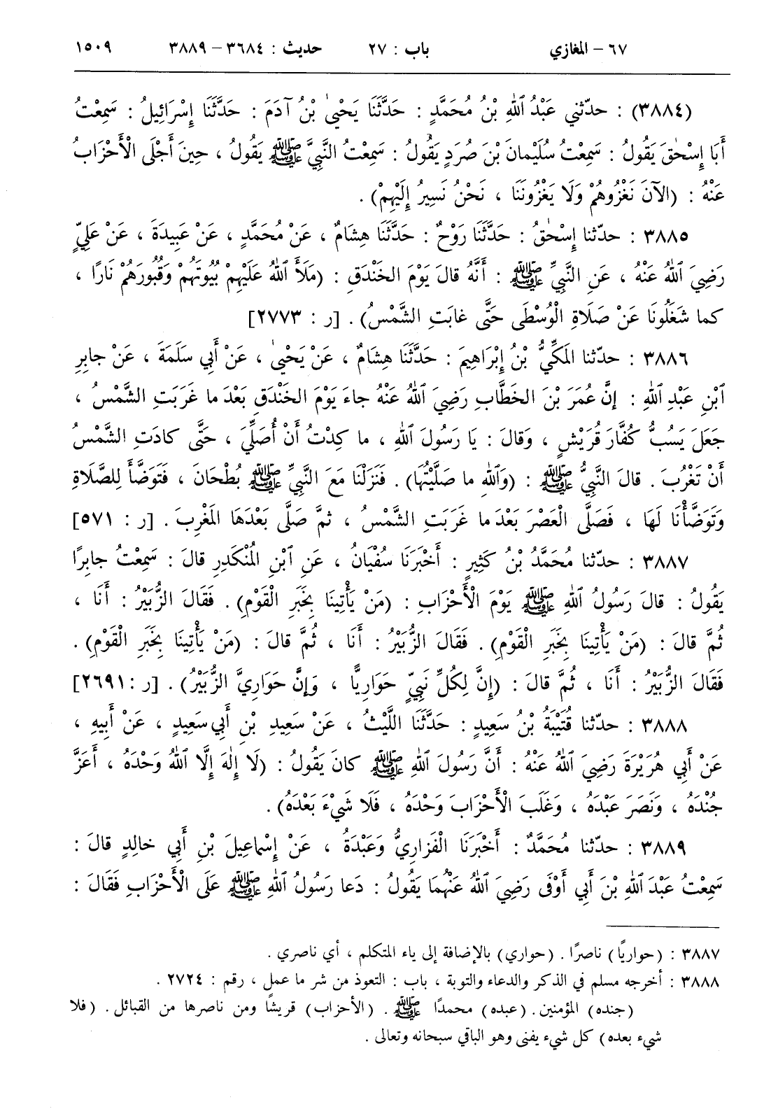 : قال رسول الله صلى الله عليه و سلم يوم الأحزاب ( من يأتينا بخبر القوم ) . فقال الزبير أنا ثم قال ( من يأتينا بخبر القوم ) . فقال الزبير أنا ثم قال ( من يأتينا بخبر القوم ) . فقال الزبير أنا ثم قال ( إن لكل نبي حواريا وأنا حواري الزبير )