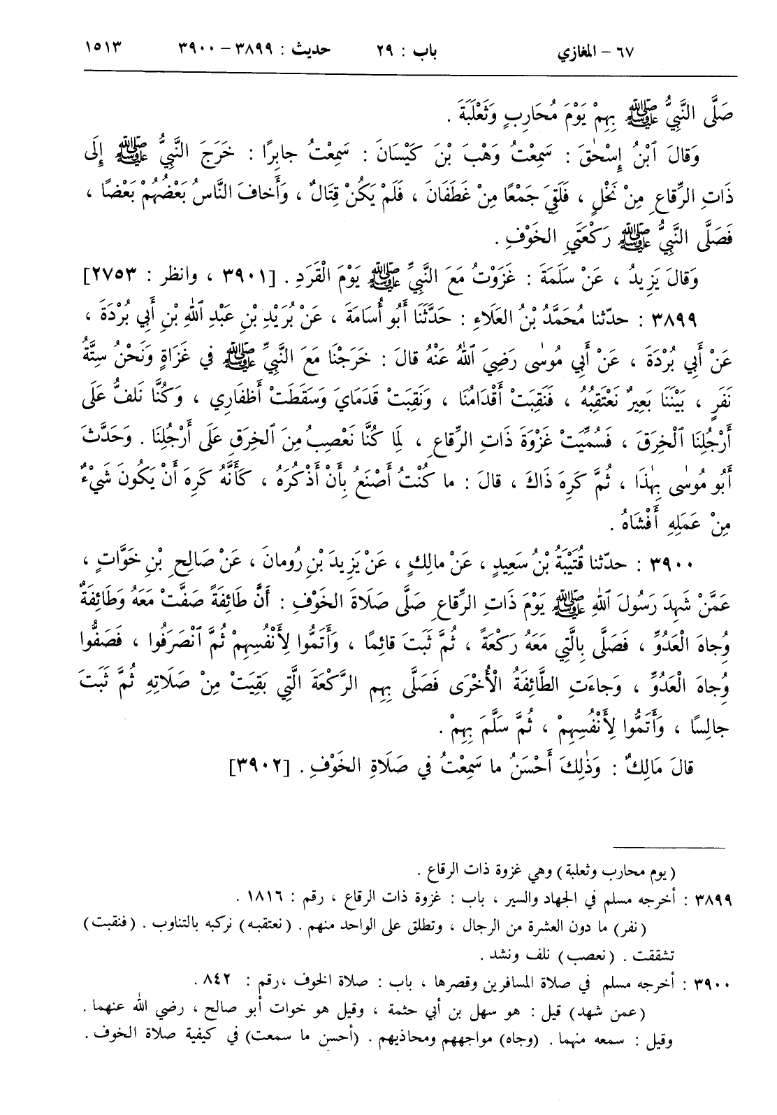 3900 - حدثنا قتيبة بن سعيد عن مالك عن يزيد بن رومان عن صالح بن خوات عمن شهد رسول الله صلى الله عليه و سلم يوم ذات الرقاع صلى صلاة الخوف أن طائفة صفت معه وطائفة وجاه العدو فصلى بالتي معه ركعة ثم ثبت قائما وأتموا لأنفسهم ثم انصرفوا فصفوا وجاه العدو وجاءت الطائفة الأخرى فصلى بهم الركعة التي بقيت من صلاته ثم ثبت جالسا وأتموا لأنفسهم ثم سلم بهم