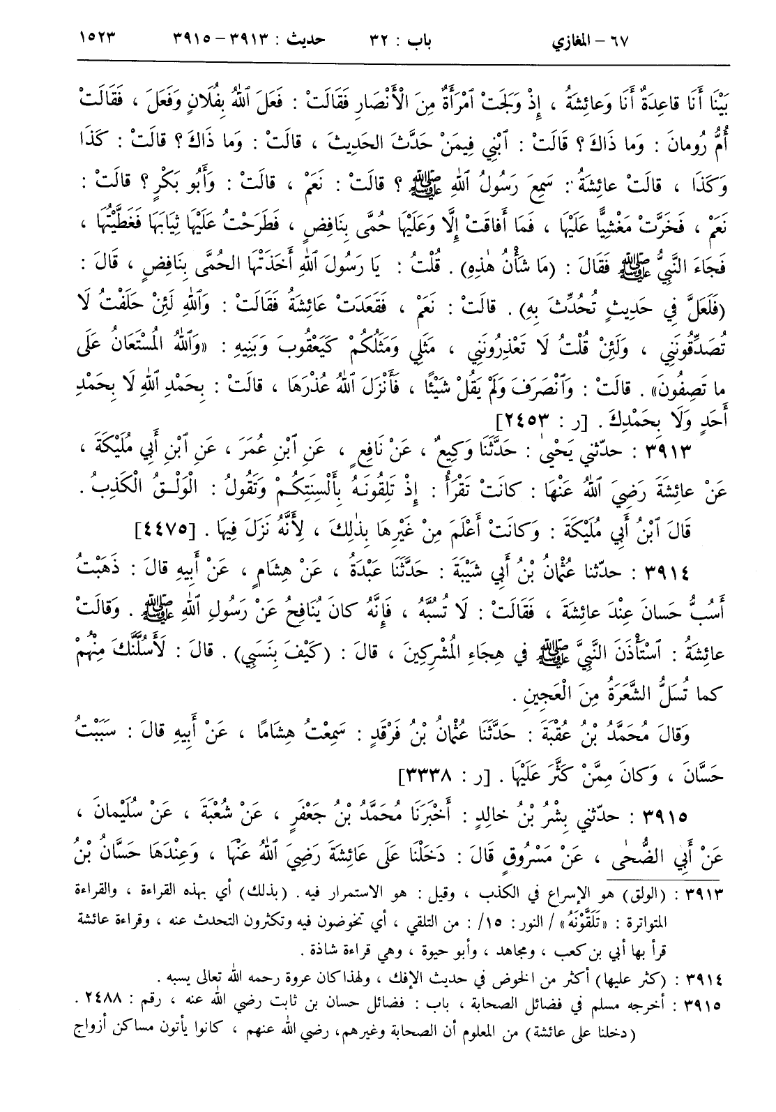 ( دخلنا على عائشة ) من المعلوم أن الصحابة وغيرهم رضي الله عنهم كانوا يأتون مساكن أزواج رسول الله صلى الله عليه و سلم ليأخذوا عنهن حديث رسول الله صلى الله عليه و سلم والعلم والموعظة وكن - رضي الله عنهن - يحدثن من يأتيهن من وراء حجاب يكون داخل بيوتهن ولا يجلسن مع من يغشى مجالسهن وجها لوجه كما هو معروف ومألوف في المجالسة وهذا هو المراد بالدخول عليهن حيثما ورد عن غير محارمهن وحاشاهن رضي الله عنهن وحاشا من يأتيهن من الصحابة رضي الله عنهم والتابعين من بعدهم أن يخالفوا أمر الله تعالى الصريح إذ يقول { وإذا سألتموهن متاعا فاسألوهن من وراء حجاب } / الأحزاب 53 / . وهي في زوجات النبي صلى الله عليه و سلم بالاتفاق وجاز لهن أن يحدثن الرجال كما جاز للرجال أن يجلسوا لهن - على ما ذكرنا - ويستمعوا لحديثهن ضرورة نقل الدين الذي عرفنه عن رسول الله صلى الله عليه و سلم بالمباشرة ولاسيما ما يخص المرأة وداخل بيت الزوجية وضمن نطاق الأسرة . وهذا كله مع ما وقر في نفوس المسلمين من وقار وإجلال لأماتهم زوجات رسول الله صلى الله عليه و سلم اللواتي قال الله تعالى فيهن { النبي أولى بالمؤمنين من أنفسهم وأزواجه أمهاتهم } / الأحزاب 6 / أي في البر والاحترام وحرمة الزواج لا في حل النظر والخلوة ونحو ذلك . ( يشبب ) من التشبيب وهو ذكر الشاعر ما يتعلق بالغزل ونحوه . ( حصان ) عفيفة تمتنع من الرجال غير زوجها . ( رزان ) صاحبة وقار وقيل قليلة الحركة . ( تزن ) تتهم . ( بريبة ) بتهمة . ( غرثى ) جائعة أي لا تغتاب الناس فتشبع من لحومهم . ( الغوافل ) العفيفات الغافلات عن الشر والفجور . ( لست كذلك ) أي لم تفعل بمقتضى ما تقول فقد اغتبت في خوضك في الإفك وطعنت واتهمت . ( تولى كبره منهم ) اهتم بإشاعته والخوض فيه أكثر من غيره / النور 11 / . ( العمى ) أي فقد آخذه الله تعالى إذ عمي آخر عمره . ( ينافح . . ) يدافع عنه بشعره ]