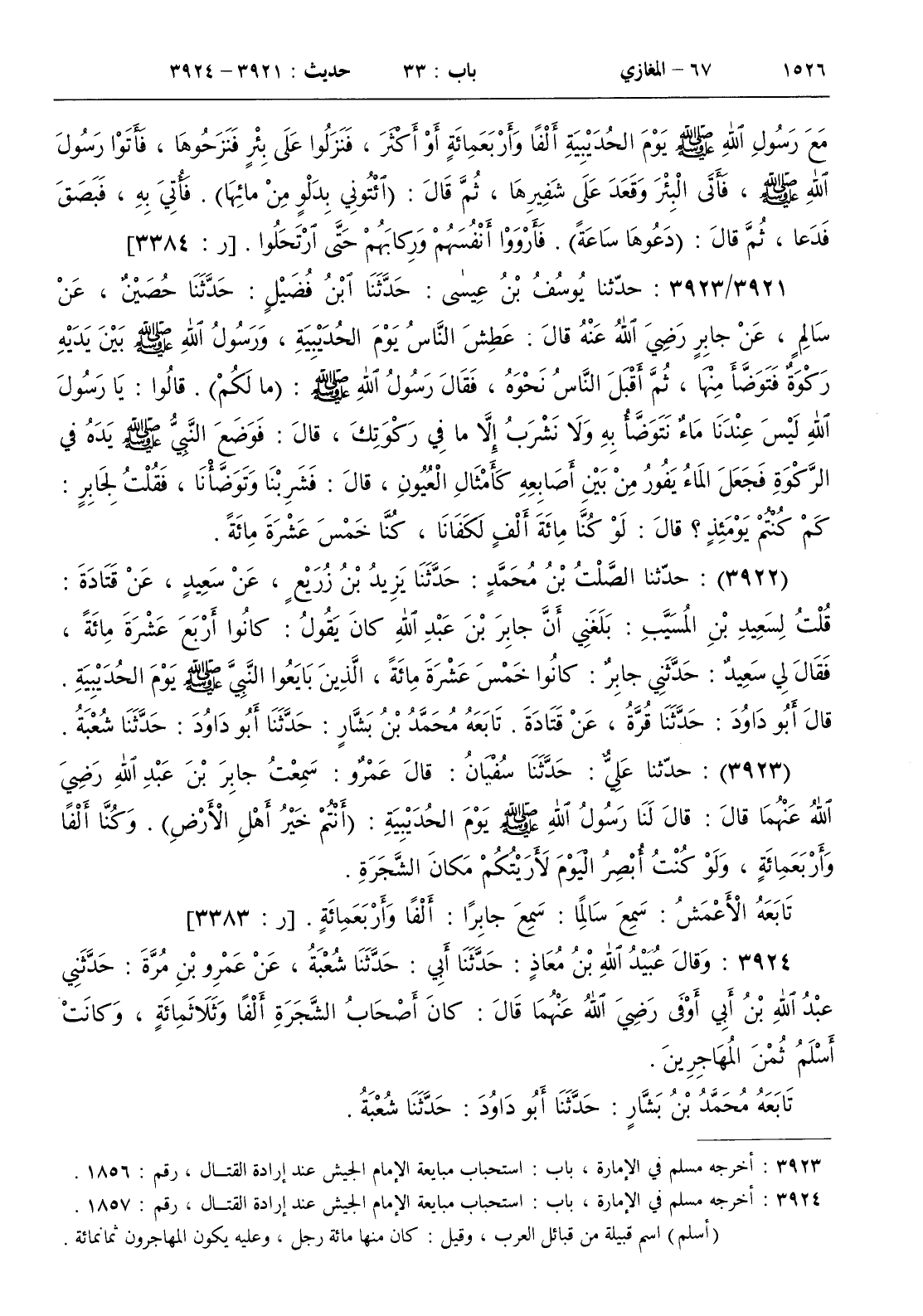 3924 - وقال عبيد الله بن معاذ حدثنا أبي حدثنا شعبة عن عمر بن مرة حدثني عبد الله بن أبي أوفى رضي الله عنهما قال كان أصحاب الشجرة ألفا وثلاثمائة وكانت أسلم ثمن المهاجرين