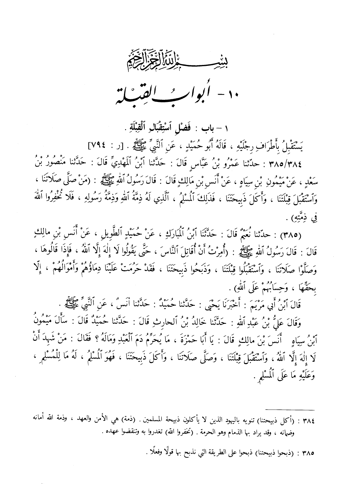وقال علي بن عبد الله حدثنا خالد بن الحارث قال حدثنا حميد قال سأل ميمون بن سيباه أنس بن مالك قال يا أبا حمزة ما يحرم دم العبد وماله ؟ فقال من شهد أن لا إله إلا الله واستقبل قبلتنا وصلى صلاتنا وأكل ذبيحتنا فهو المسلم له ما للمسلم وعليه ما على المسلم