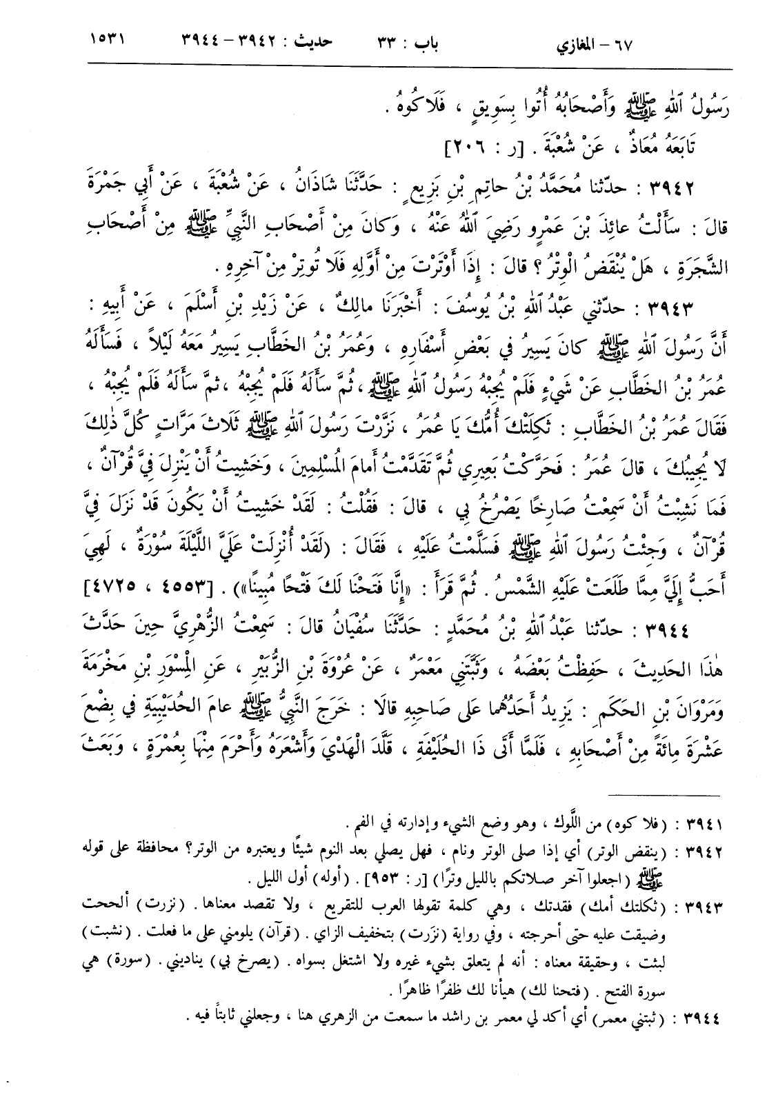 [ ش ( ثكلتك أمك ) فقدتك وهي كلمة تقولها العرب للتقريع ولا تقصد معناها . ( نزرت ) ألححت وضيقت عليه حتى أحرجته وفي رواية ( نزرت ) بتخفيف الزاي ) . ( قرآن ) يلومني على ما فعلت . ( نشبت ) لبثت وحقيقة معناه أنه لم يتعلق بشيء غيره ولا اشتغل بسواه . ( يصرخ بي ) يناديني . ( سورة ) هي سورة الفتح . ( فتحنا لك ) هيأنا لك ظفرا ظاهرا ]