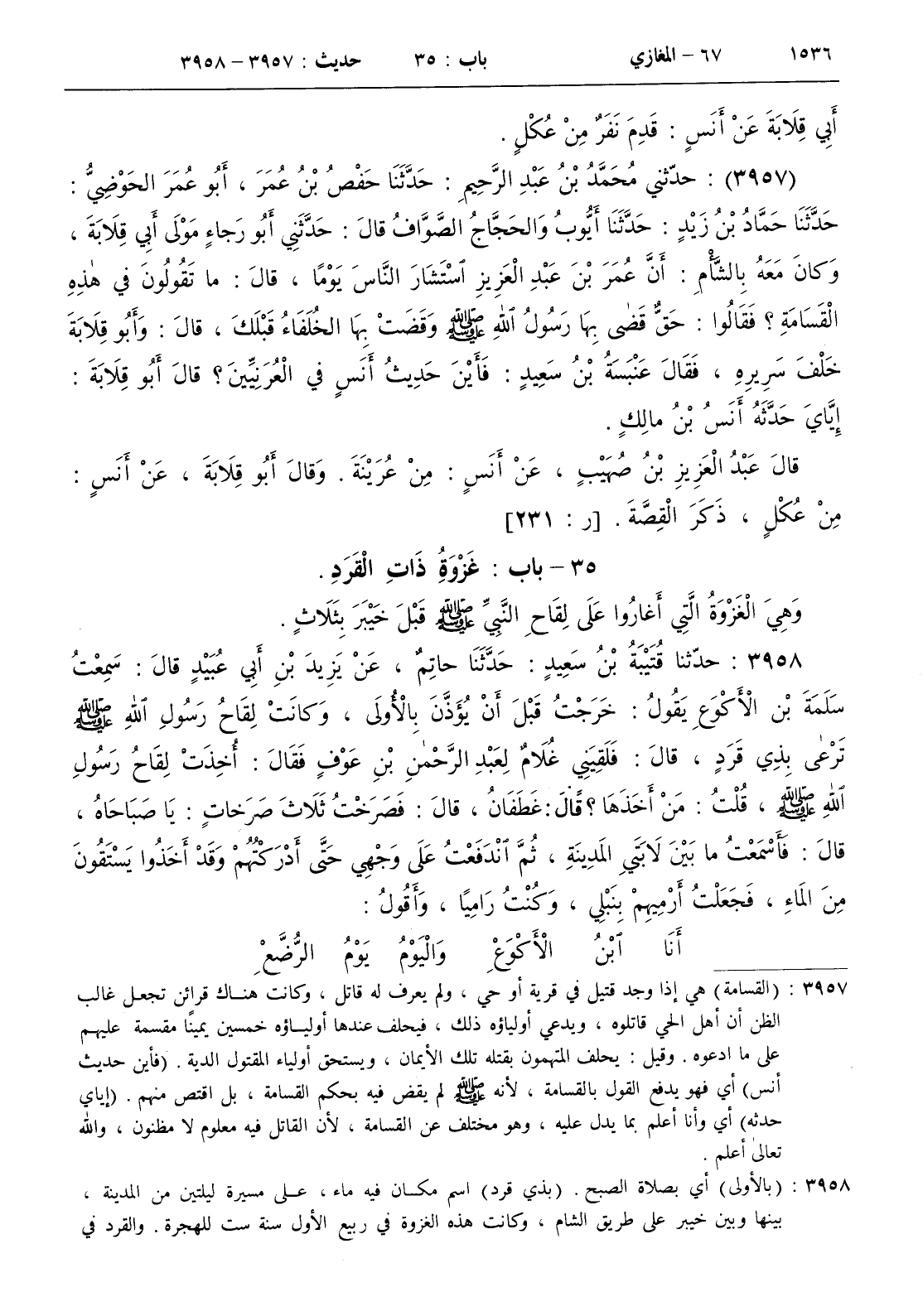 [ ش ( القسامة ) هي إذا وجد قتيل في قرية أو حي ولم يعرف له قاتل وكانت هناك قرائن تجعل غالب الظن أن أهل الحي قاتلوه ويدعي أولياؤه ذلك فيحلف عندها أولياؤه خمسين يمينا مقسمة عليهم على ما ادعوه . وقيل يحلف المتهمون بقتله تلك الأيمان ويستحق أولياء المقتول الدية . ( فأين حديث أنس ) أي فهو يدفع القول بالقسامة لأنه صلى الله عليه و سلم لم يقض فيه بحكم القسامة بل اقتص منهم . ( إياي حدثه ) أي وأنا أعلم بما يدل عليه وهومختلف عن القسامة لأن القاتل فيه معلوم لا مظنون والله تعالى أعلم ]
