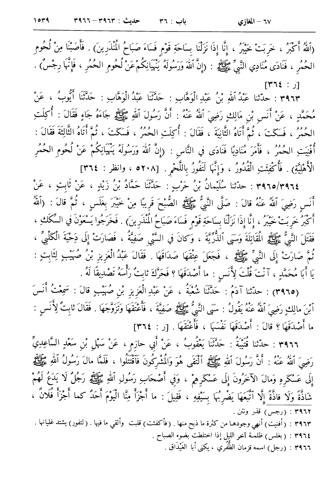: صلى النبي صلى الله عليه و سلم الصبح قريبا من خيبر بغلس ثم قال ( الله أكبر خربت خيبر إنا إذا نزلنا بساحة القوم فساء صباح المنذرين ) . فخرجوا يسعون في السكك فقتل النبي صلى الله عليه و سلم المقاتلة وسبى الذرية وكان في السبي صفية فصارت إلى دحية الكلبي ثم صارت إلى النبي صلى الله عليه و سلم فجعل عتقها صداقها . فقال عبد العزيز بن صهيب لثابت يا أبا محمد آنت قلت لأنس ما أصدقها ؟ فحرك ثابت رأسه تصديقا له