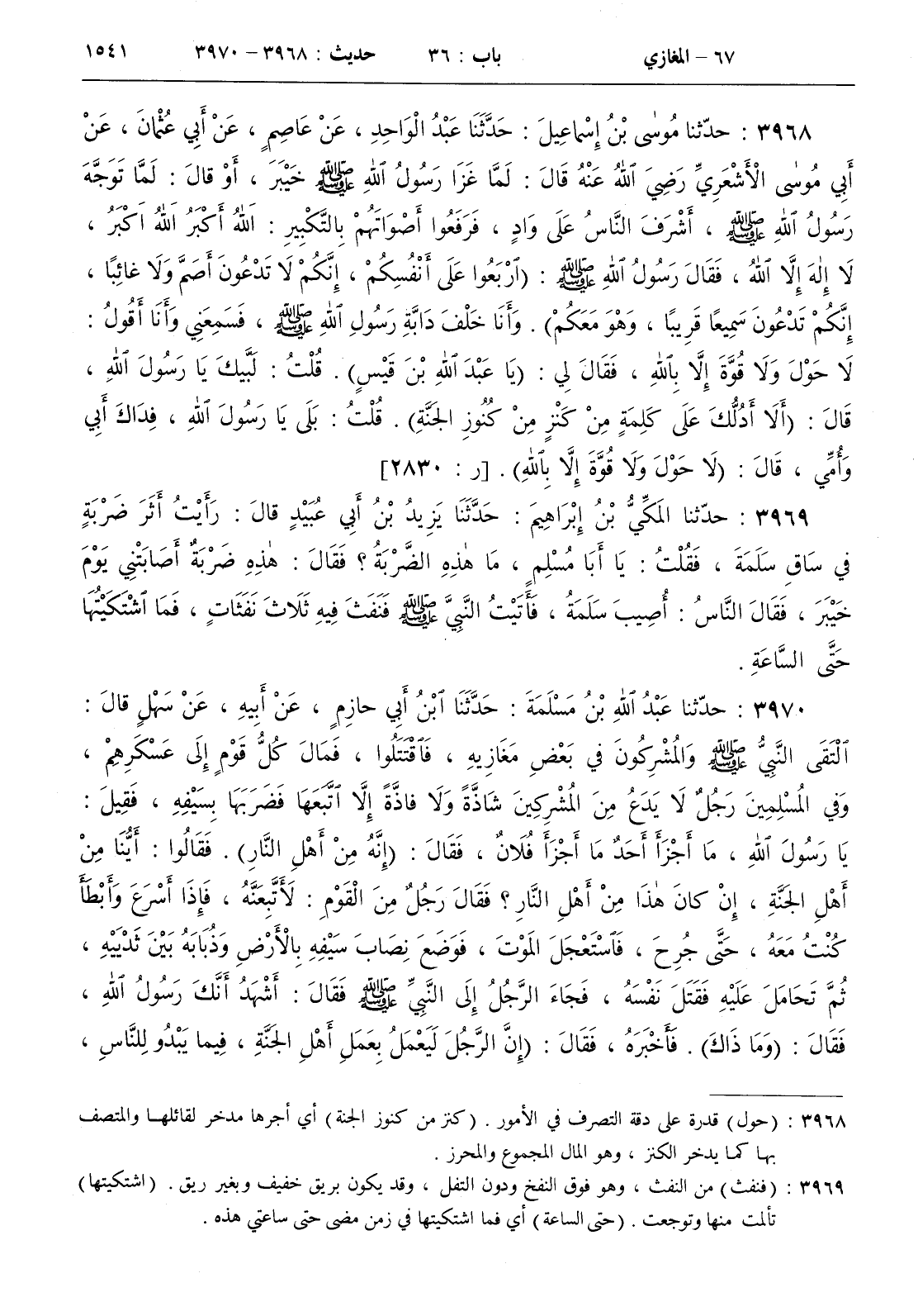 : لما غزا رسول الله صلى الله عليه و سلم خيبر أو قال لما توجه رسول الله صلى الله عليه و سلم أشرف الناس على واد فرفعوا أصواتهم بالتكبير الله أكبر الله أكبر لا إله إلا الله فقال رسول الله صلى الله عليه و سلم ( اربعوا على أنفسكم إنكم لا تدعون أصم ولا غائبا إنكم تدعون سميعا قريبا وهو معكم ) . وأنا خلف دابة رسول الله صلى الله عليه و سلم فسمعني وأنا أقول لا حول ولا قوة إلا بالله فقال لي ( يا عبد الله بن قيس ) . قلت لبيك يا رسول الله قال ( ألا أدلك على كلمة من كنز من كنوز الجنة ) . قلت بلى يا رسول الله فداك أبي وأمي قال ( لا حول ولا قوة إلا بالله )