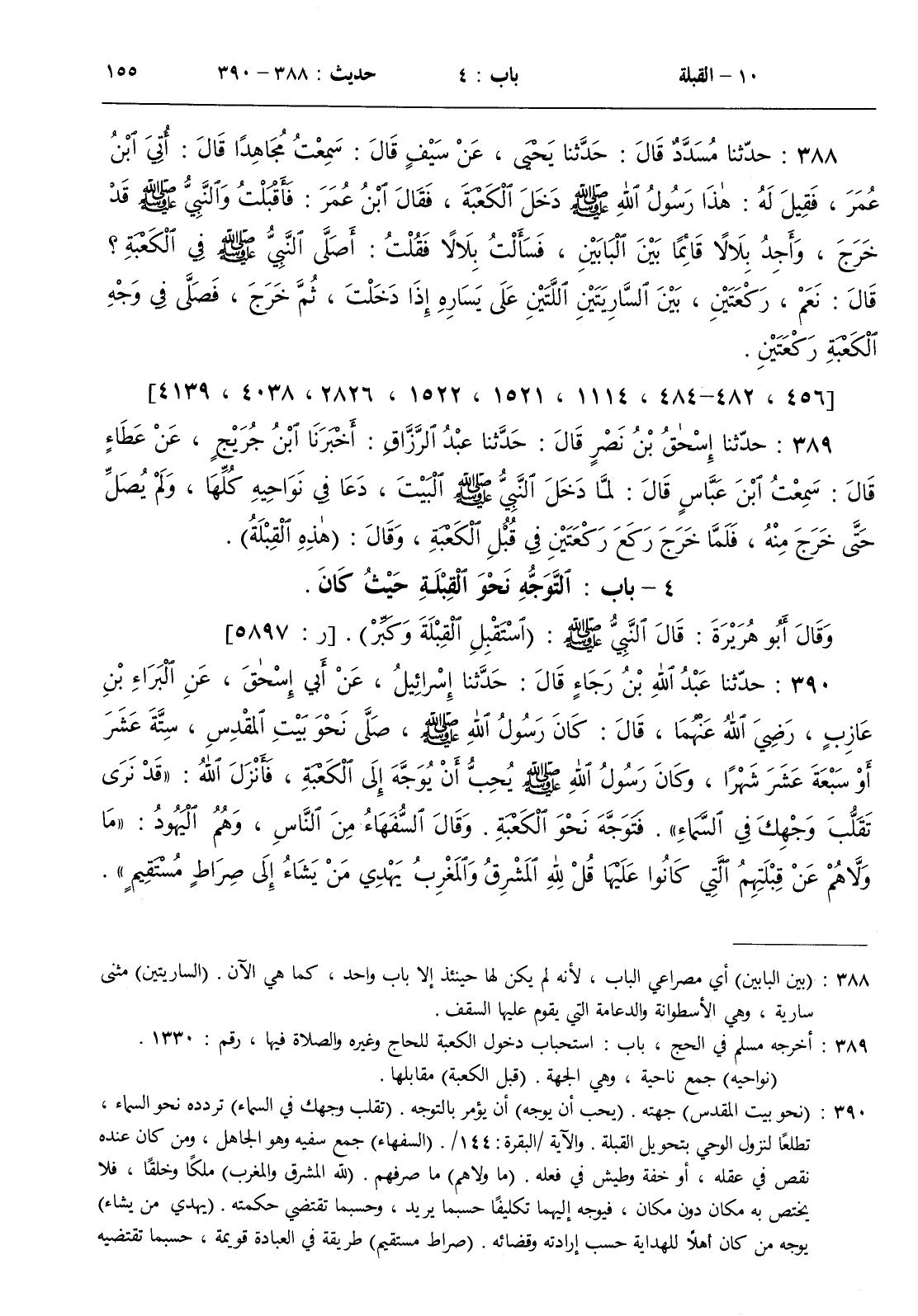 [ ش ( نحو بيت المقدس ) جهته . ( يحب أن يوجه ) أو يؤمر بالتوجه . ( تقلب وجهك في السماء ) تردده نحو السماء تطلعا لنزول الوحي بتحويل القبلة . والآية / البقرة 144 / . ( السفهاء ) جمع سفيه وهو الجاهل ومن كان عنده نقص في عقله أو خفة وطيش في فعله . ( ما ولاهم ) ما صرفهم . ( لله المشرق والمغرب ) ملكا وخلقا فلا يختص به مكان دون مكان فيوجه إليهما تكليفا حسبما يريد وحسبما تقتضي حكمته . ( يهدي من يشاء ) يوجه من كان أهلا للهداية حسب إرادته وقضائه . ( صراط مستقيم ) طريقة في العبادة قويمة حسبما تقتضيه حكمته تعالى . والآية / البقرة 142 / . ( رجل ) هو عباد بن بشر رضي الله عنه . ( هو يشهد ) يريد نفسه . ( فتحرف القوم ) عدلوا عن جهتهم ومالوا ]