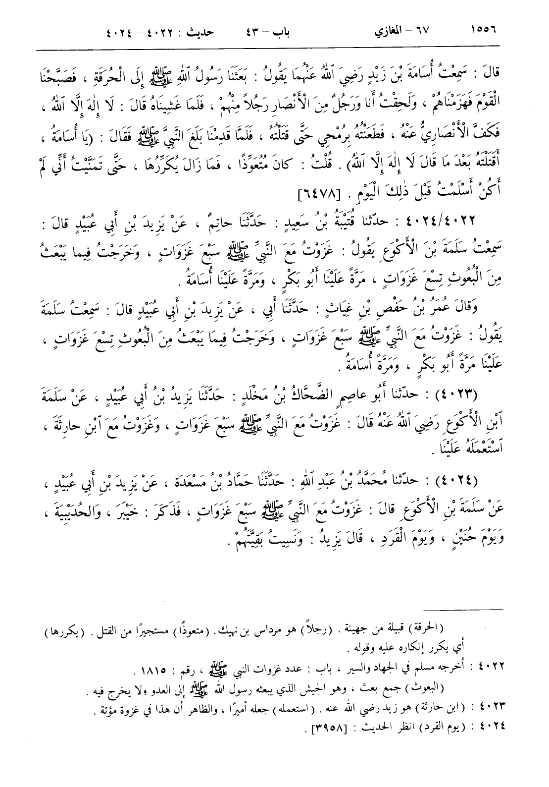 4023 - حدثنا أبو عاصم الضحاك بن مخلد حدثنا يزيد بن أبي عبيد عن سلمة بن الأكوع رضي الله عنه قال غزوت مع النبي صلى الله عليه و سلم سبع غزوات وغزوت مع ابن حارثة استعمله علينا