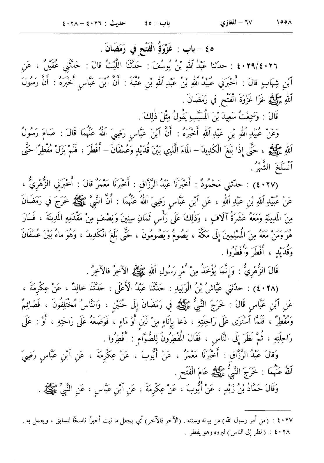 وقال عبد الرزاق أخبرنا معمر عن أيوب عن عكرمة عن ابن عباس رضي الله عنهما خرج النبي صلى الله عليه و سلم عام الفتح