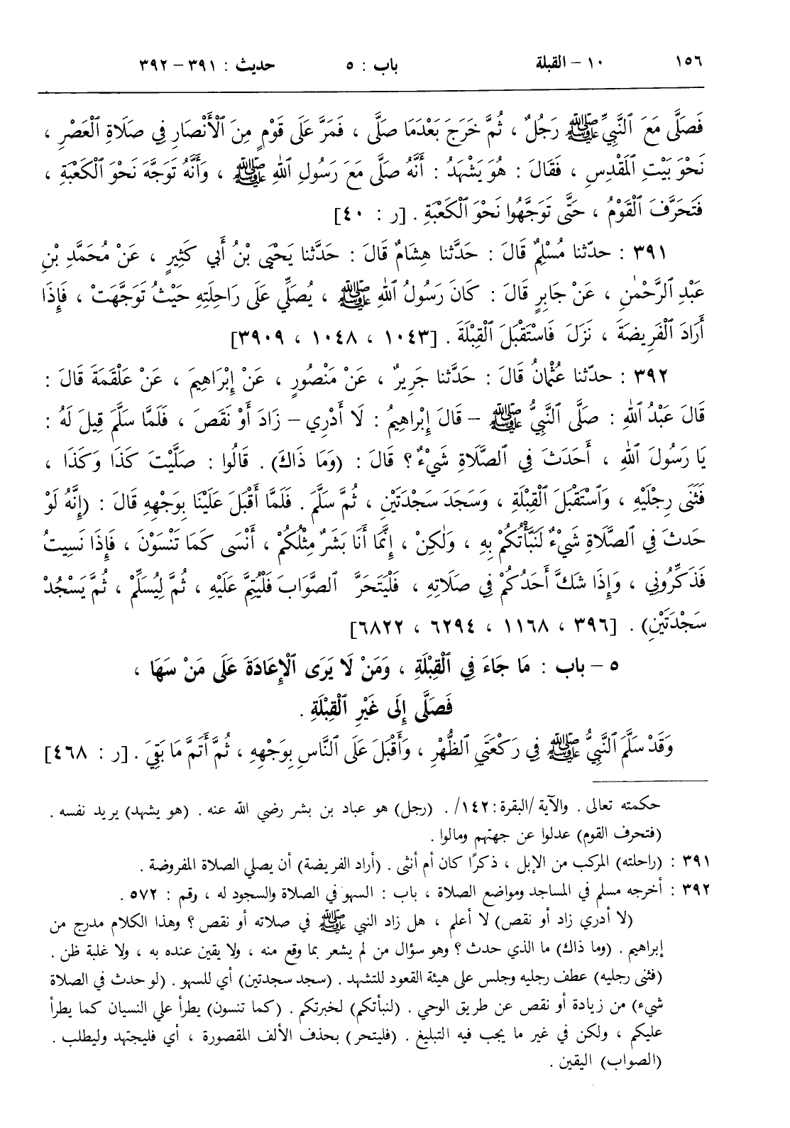 ( لا أدري زاد أو نقص ) لا أعلن هل زاد النبي صلى الله عليه و سلم في صلاته أو نقص ؟ وهذا الكلام مدرج من إبراهيم . ( وما ذاك ) ما الذي حدث ؟ وهو سؤال من لم يشعر بما وقع منه ولا يقين عنده به ولا غلبة ظن . ( فثنى رجليه ) عطف رجليه وجلس على هيئة العقود للتشهد . ( سجد سجدتين ) أي للسهو . ( لو حدث في الصلاة شيء ) من زيادة أو نقصان عن طريق الوحي . ( لنبأتكم ) لخبرتكم . ( كما تنسون ) يطرأ علي النسيان كما يطرأ عليكم ولكن في غير ما يجب فيه التبليغ . ( فليتحر ) بحذف الألف المقصورة أي فليجتهد وليطلب . ( الصواب ) اليقين ]
