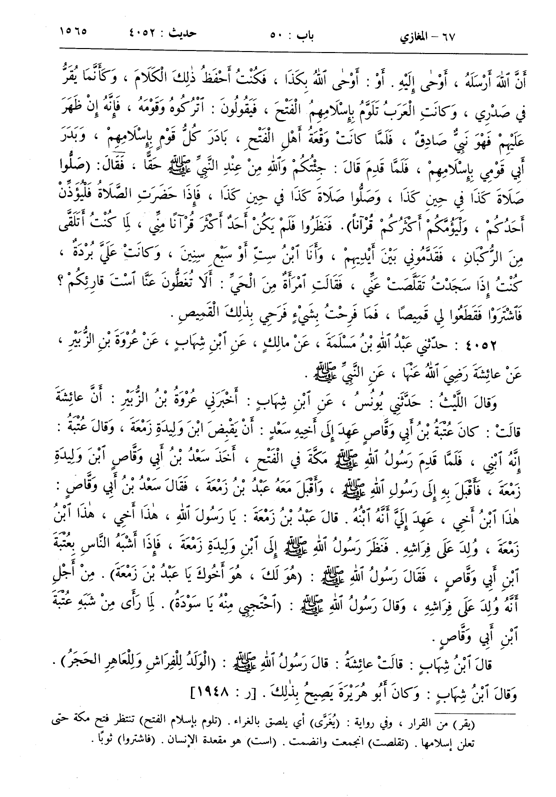 : كان عتبة بن أبي وقاص عهد إلى أخيه سعد أن يقبض ابن وليدة زمعة وقال عتبة إنه ابني فلما قدم النبي صلى الله عليه و سلم مكة في الفتح أخذ سعد بن أبي وقاص ابن وليدة زمعة فأقبل به إلى رسول الله صلى الله عليه و سلم وأقبل معه عبد بن زمعة فقال سعد بن أبي وقاص هذا ابن أخي عهد إلي أنه ابنه . قال عبد بن زمعة يا رسول الله هذا أخي هذا ابن زمعة ولد على فراشه . فنظر رسول الله صلى الله عليه و سلم إلى ابن وليدة زمعة فإذا أشبه الناس بعتبة ابن أبي وقاص فقال رسول الله صلى الله عليه و سلم ( هو لك هو أخوك يا عبد بن زمعة ) . من أجل أنه ولد على فراشه فقال رسول الله صلى الله عليه و سلم ( احتجبي منه يا سودة ) . لما رأى من شبه عتبة بن أبي وقاص