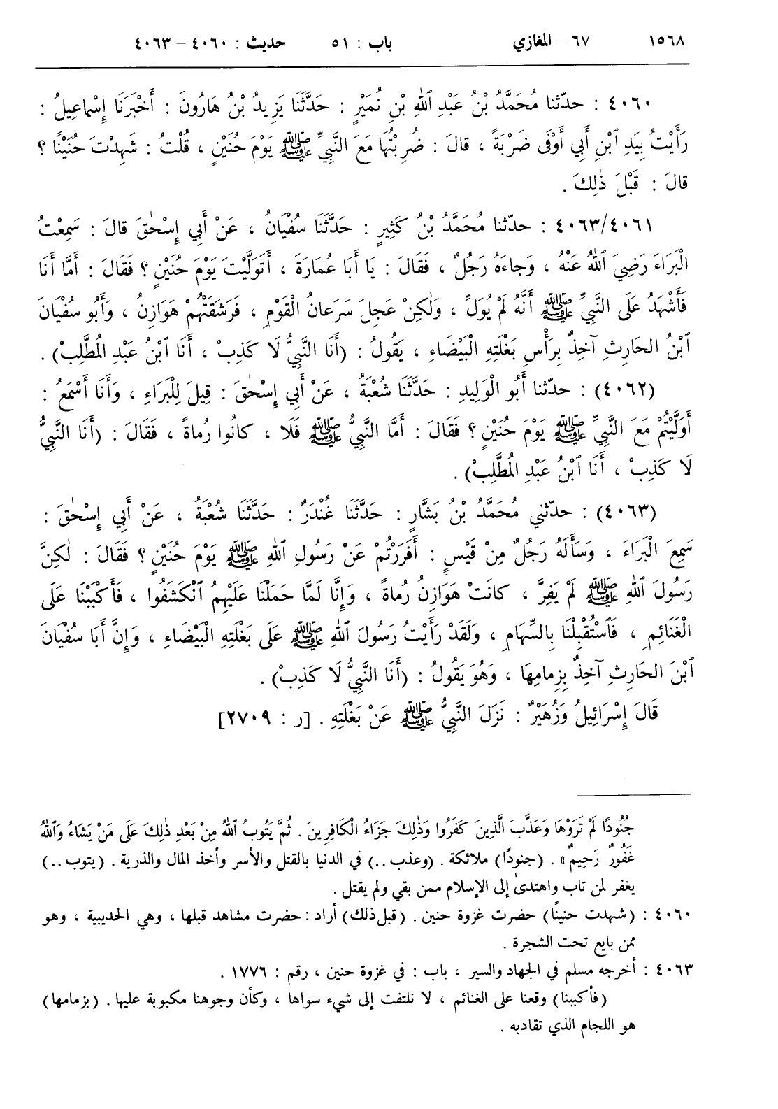 4062 - حدثنا أبو الوليد حدثنا شعبة عن أبي إسحاق قيل للبراء وأنا أسمع أوليتم مع النبي صلى الله عليه و سلم يوم حنين ؟ فقال أما النبي صلى الله عليه و سلم فلا كانوا رماة فقال ( أنا النبي لا كذب أنا ابن عبد المطلب )