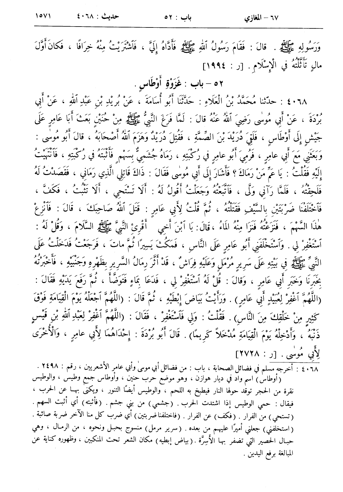 : لما فرغ النبي صلى الله عليه و سلم من حنين بعث أبا عامر على جيش إلى أوطاس فلقي دريد بن الصمة فقتل دريد وهزم الله أصحابه قال أبو موسى وبعثني مع أبي عامر فرمي أبو عامر في ركبته رماه جشمي بسهم فأثبته في ركبته فانتهيت إليه فقلت يا عم من رماك ؟ فأشار إلى أبي موسى فقال ذاك قاتلي الذي رماني فقصدت له فلحقته فلما رآني ولى فاتبعته وجعلت أقول له ألا تستحي ألا تثبت فكف فاختلفنا ضربتين بالسيف فقتلته ثم قلت لأبي عامر قتل الله صاحبك قال فانزع هذا السهم فنزعته فنزا منه الماء قال با ابن أخي أقرئ النبي صلى الله عليه و سلم السلام وقل له استعفر لي . واستخلفني أبو عامر على الناس فمكث يسيرا ثم مات فرجعت فدخلت على النبي صلى الله عليه و سلم في بيته على سرير مرمل وعليه فراش قد أثر رمال السرير بظهره وجنبيه فأخبرته بخبرنا وخبر أبي عامر وقال قل له استغفر لي فدعا بماء فتوضأ ثم رفع يديه فقال ( اللهم اغفر لعبيد أبي عامر ) . ورأيت بياض إبطيه ثم قال ( اللهم اجعله يوم القيامة فوق كثير من خلقك من الناس ) . فقلت ولي فاستغفر فقال ( اللهم اغفر لعبد الله بن قيس ذنبه وأدخله يوم القيامة مدخلا كريما ) . قال أبو بردة إحداهما لأبي عامر والأخرى لأبي موسى