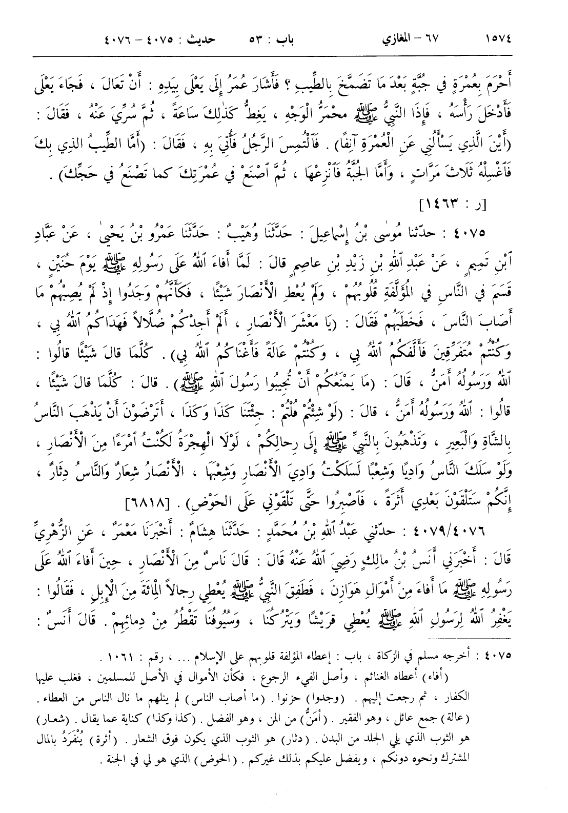 ( أفاء ) أعطاه الغنائم وأصل الفيئ الرجوع فكأن الأموال في الأصل للمسلمين فغلب عليها الكفار ثم رجعت إليهم . ( وجدوا ) حزنوا . ( ما أصاب الناس ) لم ينلهم ما نال الناس من العطاء . ( عالة ) جمع عائل وهو الفقير . ( أمن ) من المن وهو الفضل . ( كذا وكذا ) كناية عما يقال . ( شعار ) هو الثوب الذي يلي الجلد من البدن . ( دثار ) هو الثوب الذي يكون فوق الشعار . ( أثرة ) ينفرد بالمال المشترك ونحوه دونكم ويفضل عليكم بذلك غيركم . ( الحوض ) الذي هو لي في الجنة ]