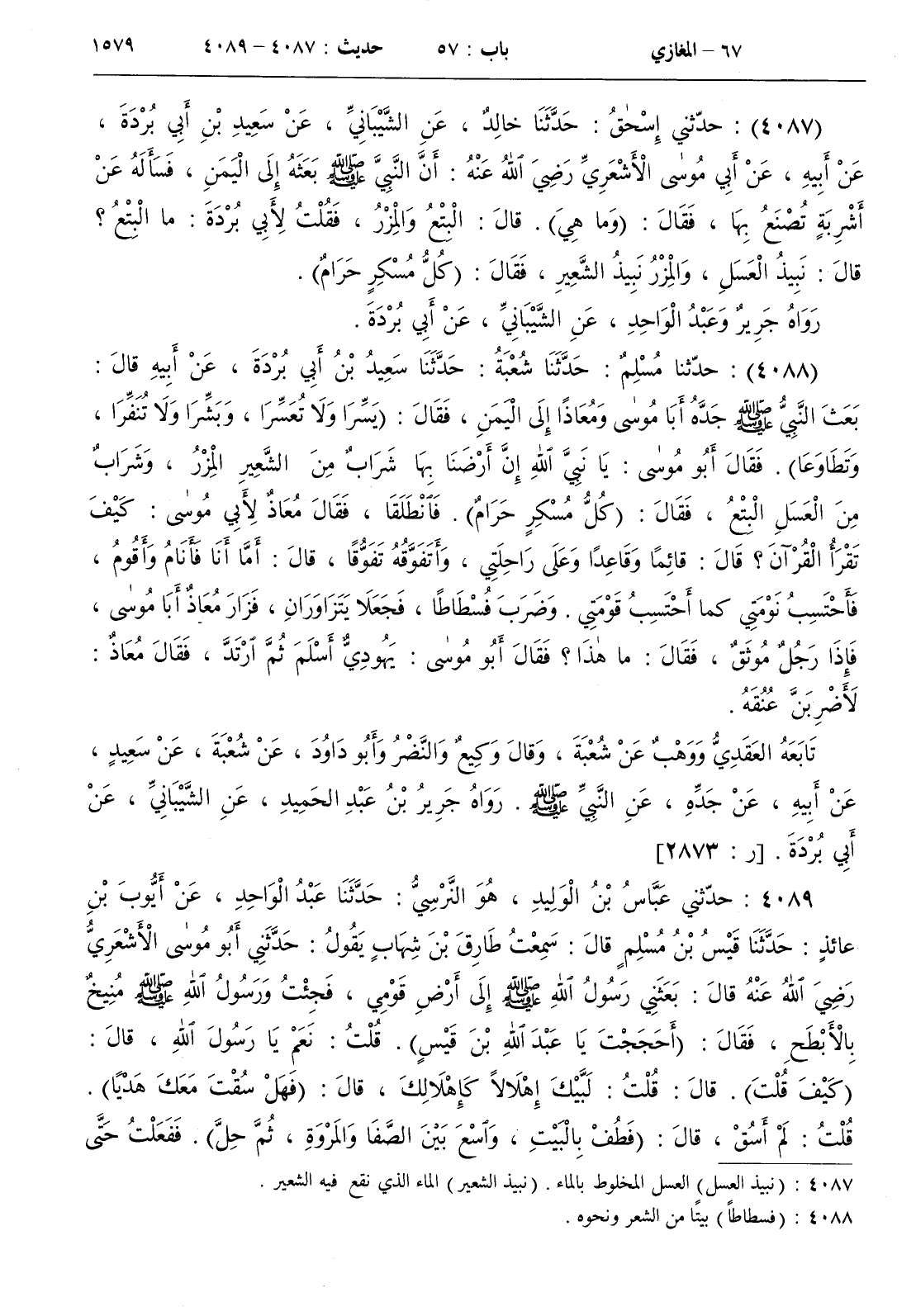 : أن النبي صلى الله عليه و سلم بعثه إلى اليمن فسأله عن أشربة تصنع بها فقال ( وما هي ) . قال البتع والمزر فقلت لأبي بردة ما البتع ؟ قال نبيذ العسل والمزر نبيذ الشعير فقال ( كل مسكر حرام )