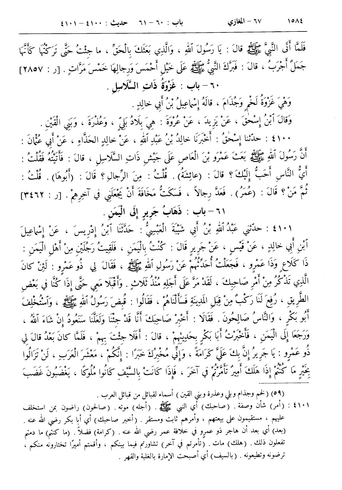 : أن رسول الله صلى الله عليه و سلم بعث عمرو بن العاص على جيش ذات السلاسل قال فأتيته فقلت أي الناس أحب إليك ؟ قال ( عائشة ) . قلت من الرجال ؟ قال ( أبوها ) . قلت ثم من ؟ قال ( عمر ) . فعد رجالا فسكت مخافة أن يجعلني في آخرهم