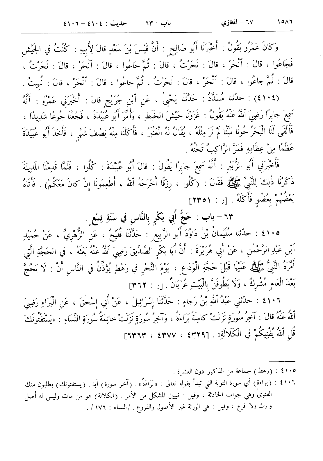 4104 - حدثنا مسدد حدثنا يحيى عن ابن جريج قال أخبرني عمرو أنه سمع جابرا رضي الله عنه يقول غزونا جيش الخبط وأمر أبو عبيدة فجعنا جوعا شديدا فألقى لنا البحر حوتا ميتا لم نر مثله يقال له العنبر فأكلنا منه نصف شهر فأخذ أبو عبيدة عظما من عظامه فمر الراكب تحته