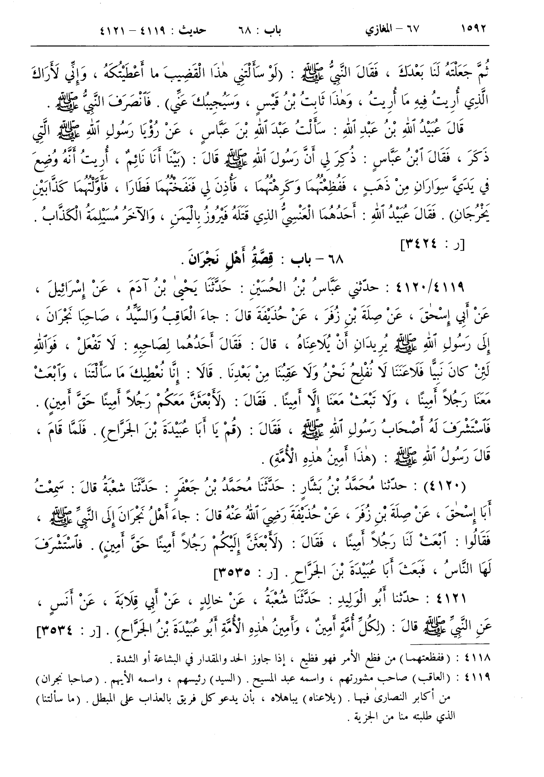 : جاء العاقب والسيد صاحبا نجران إلى رسول الله صلى الله عليه و سلم يريدان أن يلاعناه قال فقال أحدهما لصاحبه لا تفعل فوالله لئن كان نبيا فلاعننا لا نفلح نحن ولا عقبنا من بعدنا . قالا إنا نعطيك ما سألتنا وابعث معنا رجلا أمينا ولا تبعث معنا إلا أمينا . فقال ( لأبعثن معكم رجلا أمينا حق أمين ) . فاستشرف له أصحاب رسول الله صلى الله عليه و سلم فقال ( قم يا أبا عبيدة بن الجراح ) . فلما قام قال رسول الله صلى الله عليه و سلم ( هذا أمين هذه الأمة )