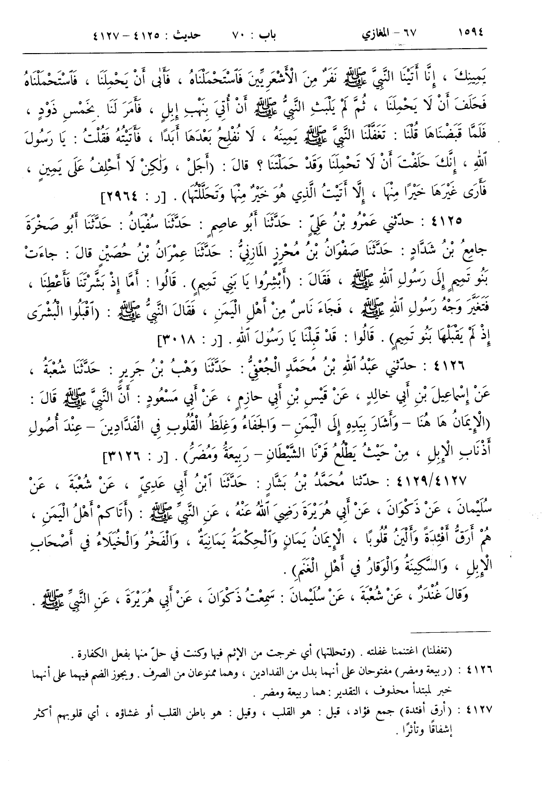 4125 - حدثني عمرو بن علي حدثنا أبو عاصم حدثنا سفيان حدثنا أبو صخرة جامع بن شداد حدثنا صفوان بن محرز المازني حدثنا عمران ابن حصين قال جاءت بنو تميم إلى رسول الله صلى الله عليه و سلم فقال ( أبشروا يا بني تميم ) . قالوا أما إذ بشرتنا فأعطنا فتغير وجه رسول الله صلى الله عليه و سلم فجاء ناس من أهل اليمن فقال النبي صلى الله عليه و سلم ( اقبلوا البشرى إذ لم يقبلها بنو تميم ) . قالوا قد قبلنا يا رسول الله
