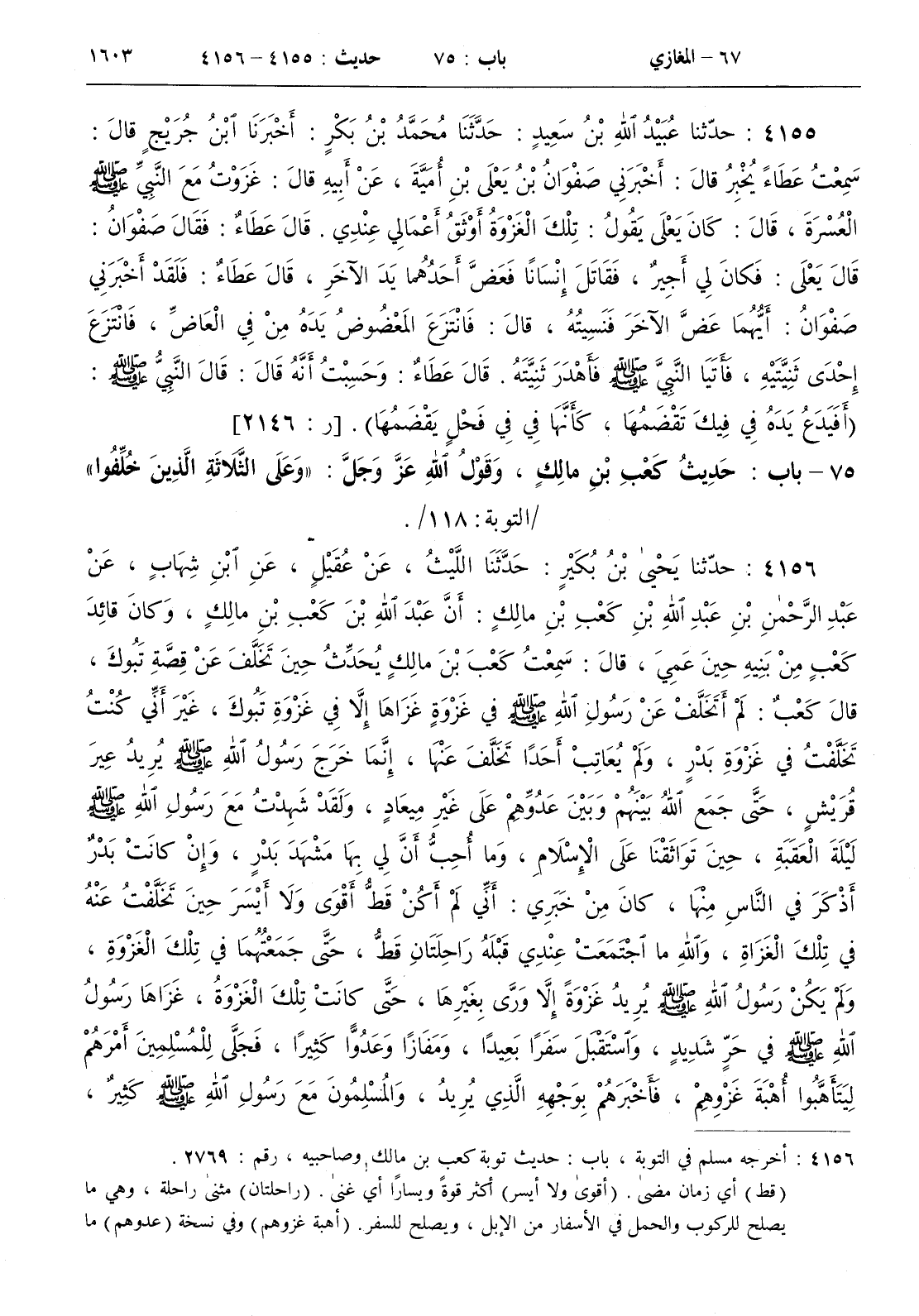 4156 - حدثنا يحيى بن بكير حدثنا الليث عن عقيل عن ابن شهاب عن عبد الرحمن بن عبد الله بن كعب بن مالك أن عبد الله بن كعب بن مالك وكان قائد كعب من بنيه حين عمي قال سمعت كعب بن مالك يحدث حين تخلف عن قصة تبوك قال كعب