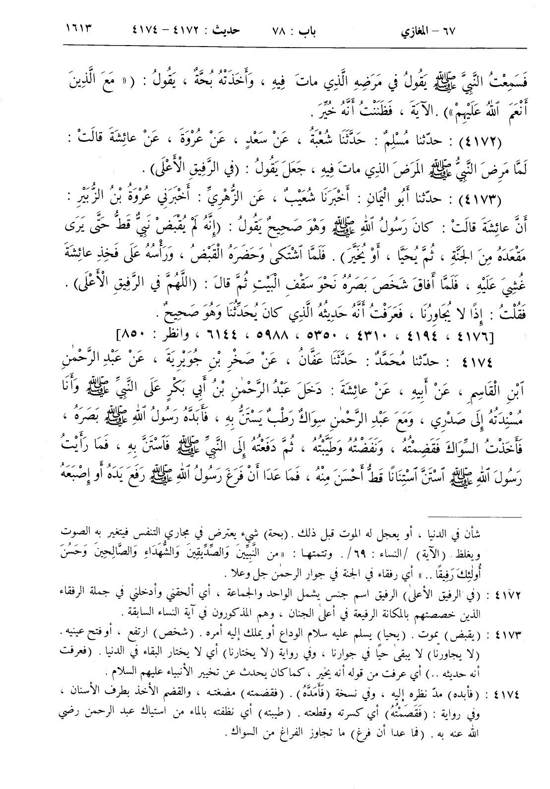 : دخل عبد الرحمن بن أبي بكر على النبي صلى الله عليه و سلم وأنا مسندته إلى صدري ومع عبد الرحمن سواك رطب يستن به فأبده رسول الله صلى الله عليه و سلم بصره فأخذت السواك فقضمته ونفضته وطيبته ثم دفعته إلى النبي صلى الله عليه و سلم فاستن به فما رأيت رسول الله صلى الله عليه و سلم استن استنانا قط أحسن منه فما عدا أن فرغ رسول الله صلى الله عليه و سلم رفع يده أو إصبعه ثم قال ( في الرفيق الأعلى ) . ثلاثا ثم قضى وكانت تقول مات بين حاقنتي وذاقنتي