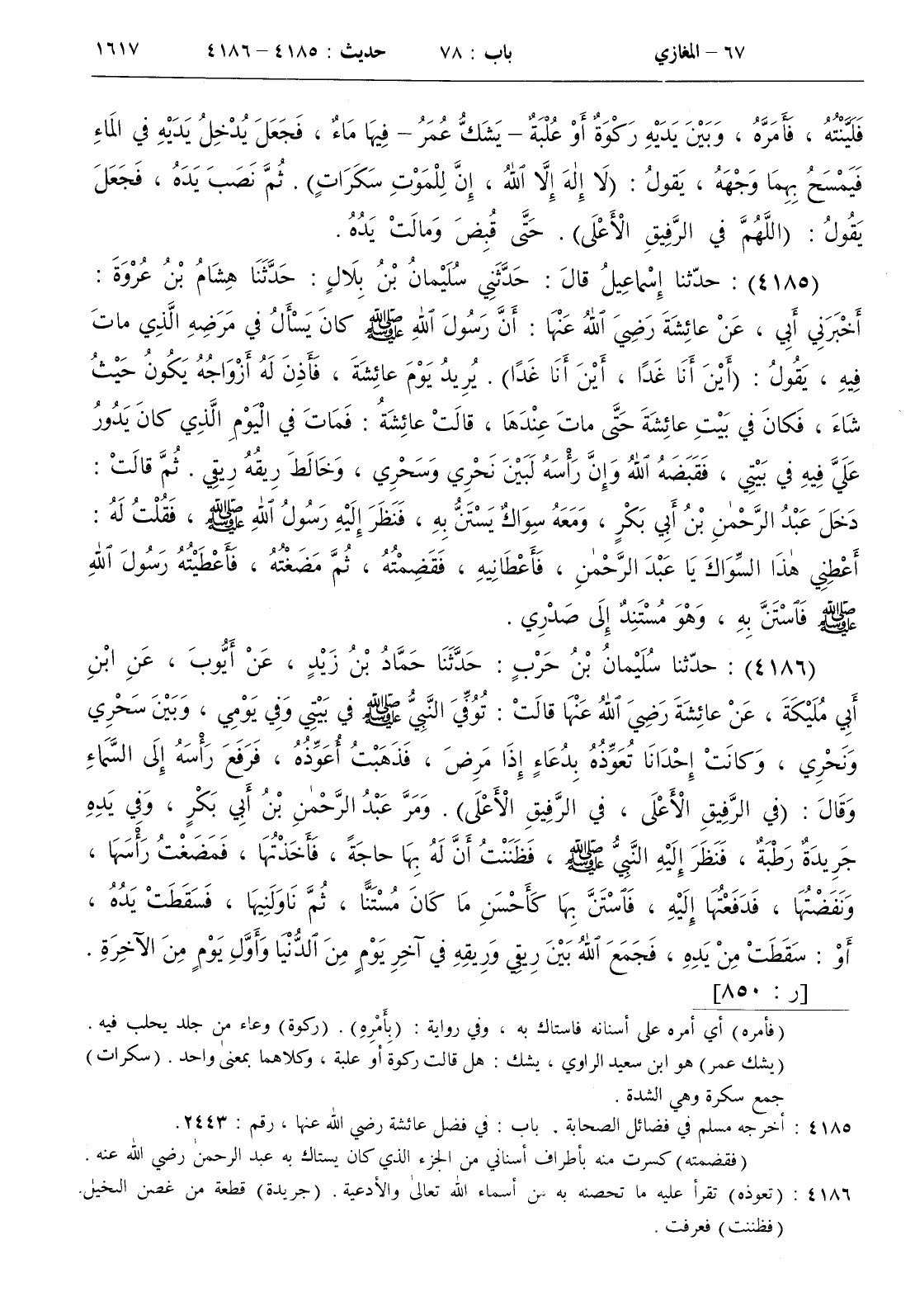 : توفي النبي صلى الله عليه و سلم في بيتي وفي يومي وبين سحري ونحري وكانت إحدانا تعوذه بدعاء إذا مرض فذهبت أعوذه فرفع رأسه إلى السماء وقال ( في الرفيق الأعلى في الرفيق الأعلى ) . ومر عبد الرحمن بن أبي بكر وفي يده جريدة رطبة فنظر اليه النبي صلى الله عليه و سلم فظننت أن له بها حاجة فأخذتها فمضغت رأسها ونفضتها فدفعنها إليه فاستن بها كأحسن ما كان مستنا ثم ناولنيها فسقطت يده أو سقطت من يده فجمع الله بين ريقي وريقه في آخر يوم من الدنيا وأول يوم من الآخرة