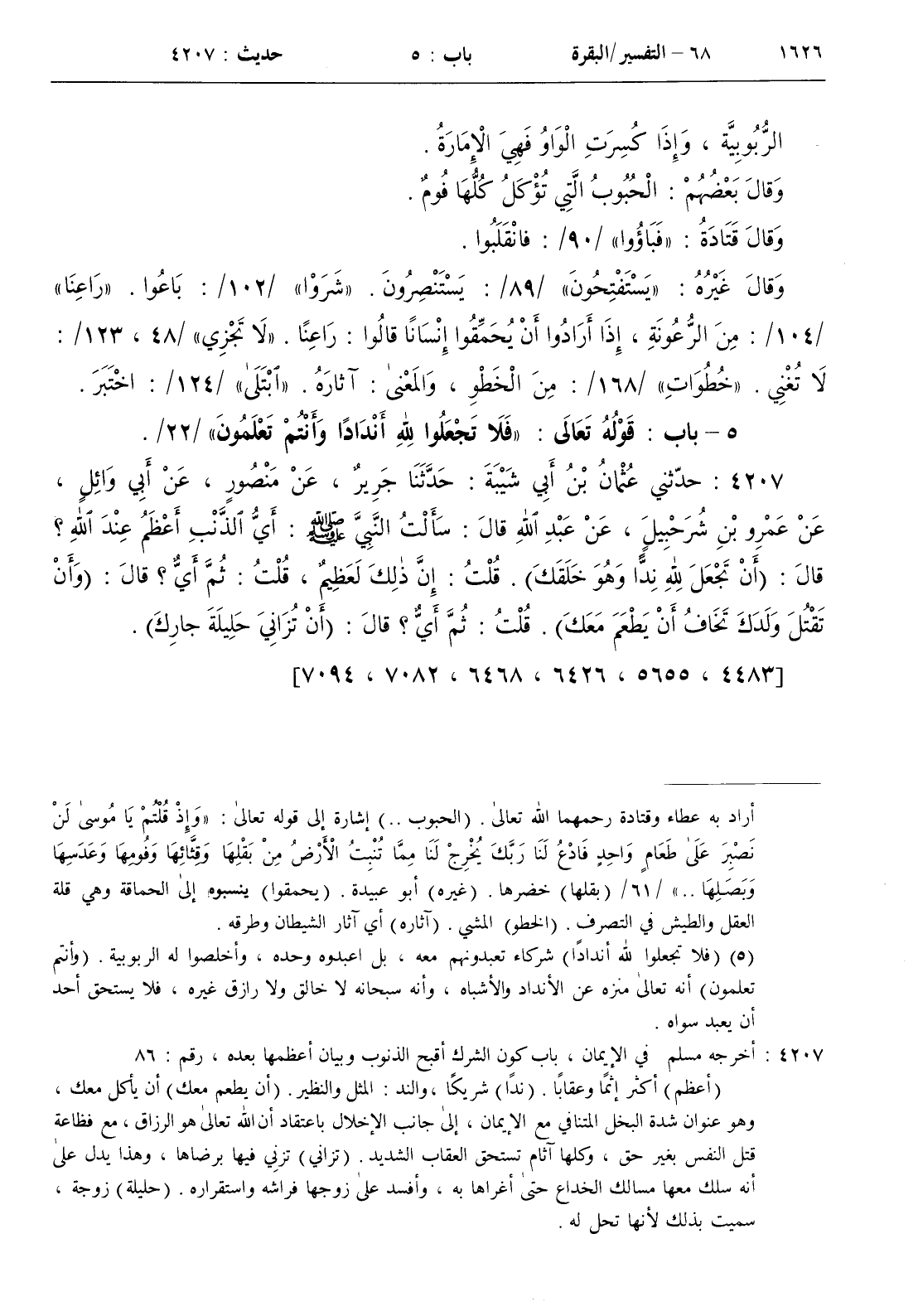 [ ش ( أخرجه مسلم في الإيمان باب كون الشرك أقبح الذنوب وبيان أعظمها بعده رقم 86 ) ( أعظم ) أكثر إثما وعقابا . ( ندا ) شريكا والند المثل والنظير . ( أن يطعم معك ) أن يأكل معك وهو عنوان شدة البخل المتنافي مع الإيمان إلى جانب الإخلال باعتقاد أن الله تعالى هو الرزاق مع فظاعة قتل النفس بغير حق وكلها آثام تستحق العقاب الشديد . ( تزاني ) تزني فيها برضاها وهذا يدل على أنه سلك معها مسالك الخداع حتى أغراها به وأفسد على زوجها فراشه واستقراره . ( حليلة ) زوجة سميت بذلك لأنها تحل له ]