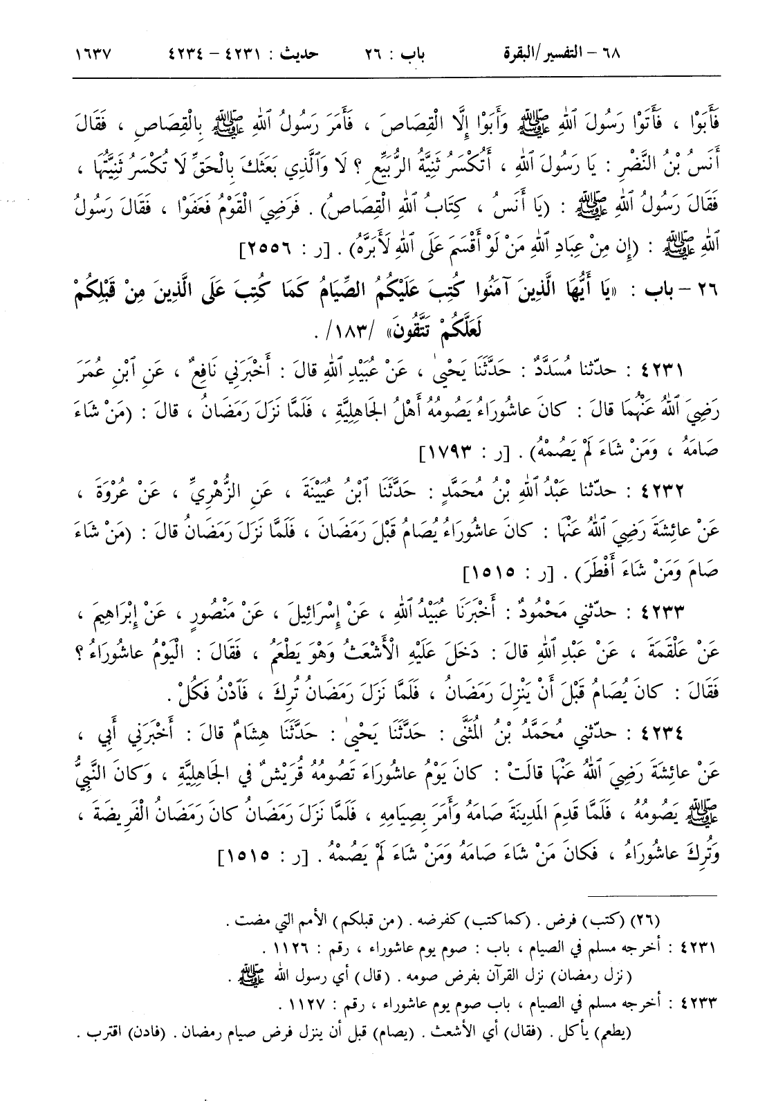 : كان يوم عاشوراء تصومه قريش في الجاهلية وكان النبي صلى الله عليه و سلم يصومه فلما قدم المدينة صامه وأمر بصيامه فلما نزل رمضان كان رمضان الفريضه وترك عاشوراء فكان من شاء صامه ومن شاء لم يصمه