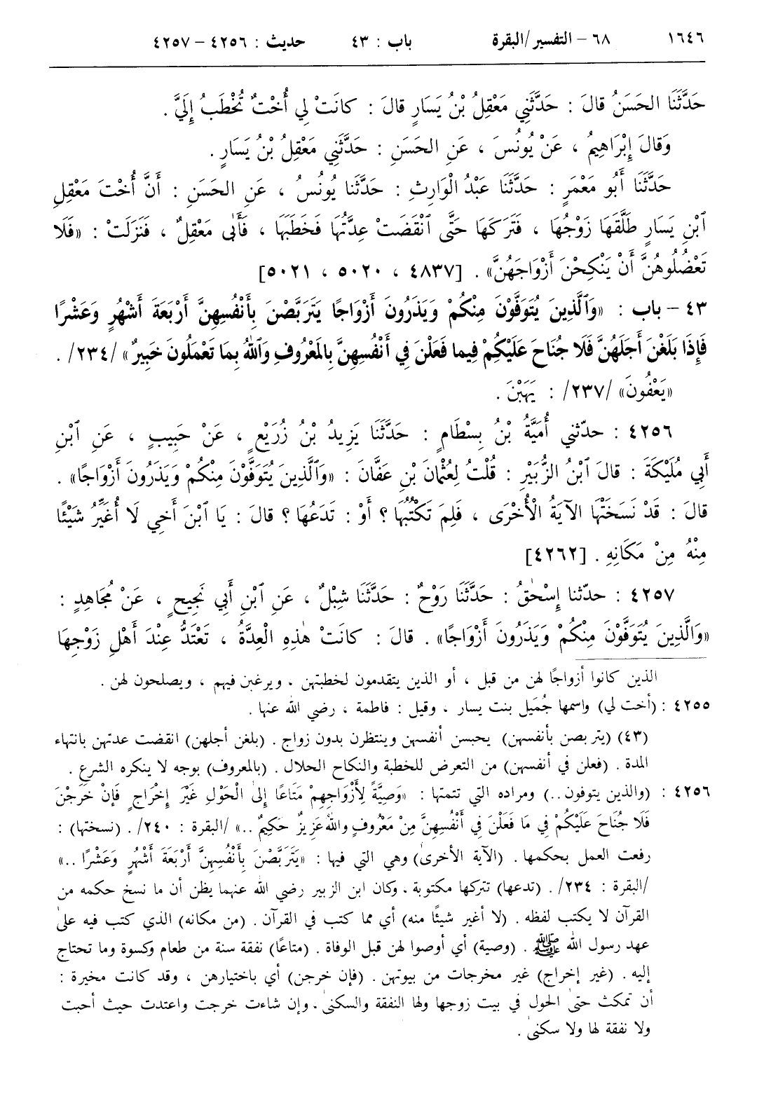 [ ش ( والذين يتوفون . . ) ومراده التي تتمتها { وصية لأزواجهم متاعا إلى الحول غير إخراج فإن خرجن فلا جناح عليكم في ما فعلن في أنفسهن من معروف والله عزير حكيم . . } / البقرة 240 / . ( نسختها ) رفعت العمل بحكمها . ( الآية الأخرى ) وهي التي فيها { يتربصن بأنفسهن أربعة أشهر وعشرا . . } / البقرة 234 / . ( تدعها ) تتركها مكتوبة وكان ابن الزبير رضي الله عنهما يظن أن ما نسخ حكمه من القرآن لا يكتب لفظه . ( لا أغير شيئا منه ) أي مما كتب في القرآن . ( من مكانه ) الذي كتب فيه على عهد رسول الله صلى الله عليه و سلم . ( وصية ) أي أوصوا لهن قبل الوفاة . ( متاعا ) نفقة سنة من طعام وكسوة وما تحتاج إليه . ( غير إخراج ) غير مخرجات من بيوتهن . ( فإن خرجن ) أي باختيارهن وقد كانت مخيرة أن تمكث حتى الحول في بيت زوجها ولها النفقة والسكنى وإن شاءت خرجت واعتدت حيث أحبت ولا نفقة لها ولا سكنى ]