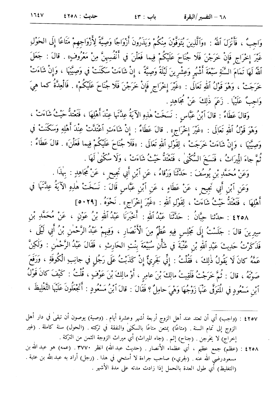 [ ش ( عظم ) جمع عظيم أي عظماء الأنصار . ( حديث عبد الله ) انظر 3770 . ( عمه ) هو عبد الله بن مسعود رضي الله عنه . ( لجريء ) صاحب جراءة لا أستحي في هذا . ( رجل ) أراد به عبد الله بن عتبة . ( التغليظ ) أي طول العدة بالحمل اذا زادت مدته على مدة الأشهر . ( الرخصة ) إذا وضعت في أقل من أربعة أشهر وعشرة أيام . ( القصرى ) وهي سورة الطلاق وفيها { وأولات الأحمال أجلهن أن يضعن حملهن . . } / الطلاق 4 / ( الطولى ) أطول سور القرآن وهي البقرة التي فيها { يتربصن بأنفسهن أربعة أشهر وعشرا } ومراده إنما يؤخذ بما نزل أخيرا ]