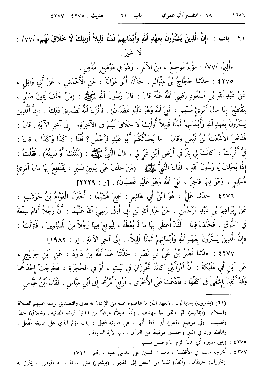 ( تخرزان ) تخيطان . ( أنفذ ) ثقبها من البطن إلى الظهر . ( بإشفى ) مثل المسلة له مقبض يخرز به الإسكاف . ( بدعواهم ) بمجرد إخبارهم عن لزوم حق لهم على الآخرين عند حاكم . ( لذهب دماء ) لضاعت وهدرت . ( يشترون بعهد الله ) يبذلونه مقابل عرض من الدنيا بخس ]