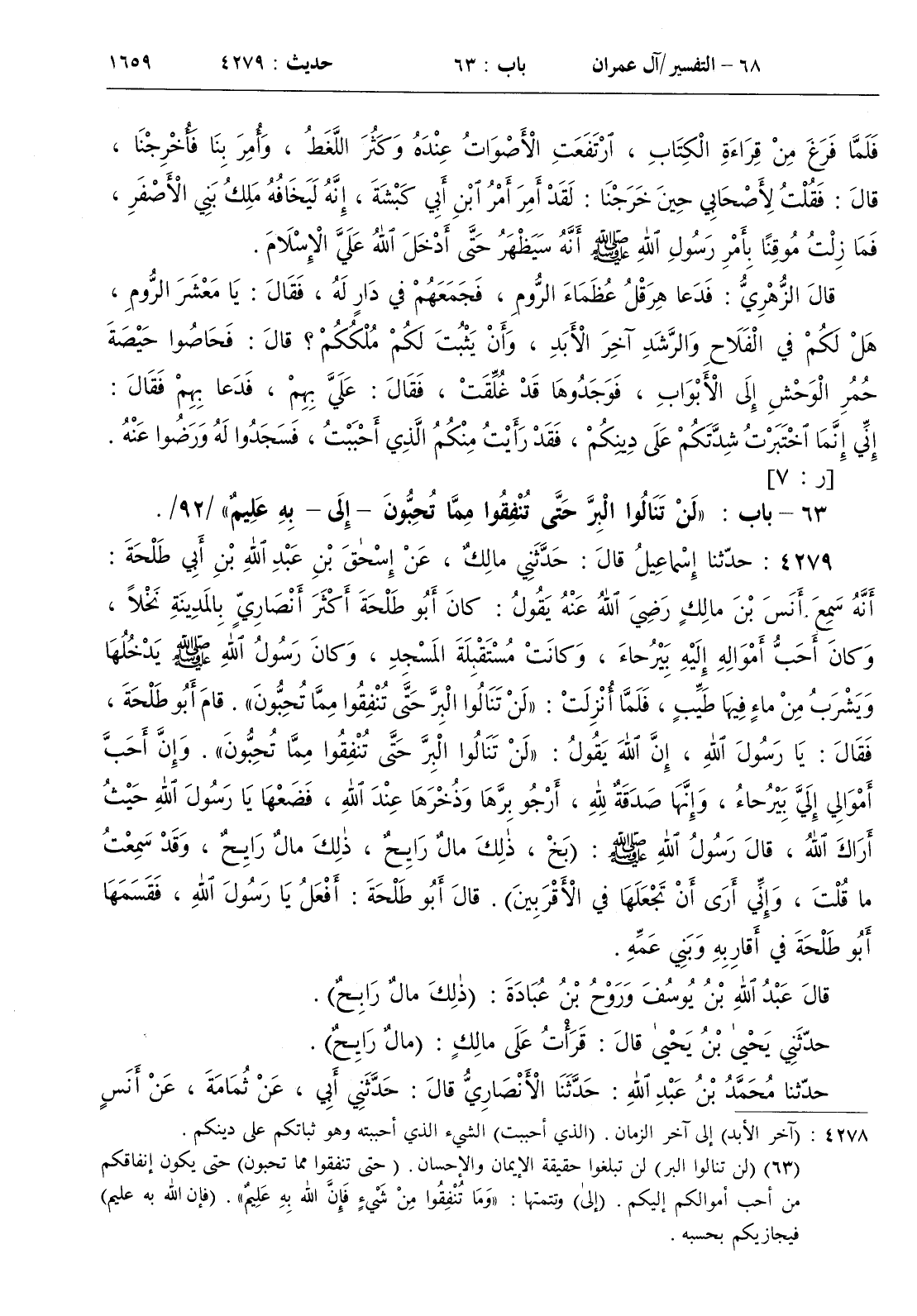: كان أبو طلحة أكثر أنصاري بالمدينة نخلا وكان أحب أمواله إليه بيرحاء وكانت مستقبلة المسجد وكان رسول الله صلى الله عليه و سلم يدخلها ويشرب من ماء فيها طيب فلما نزلت { لن تنالوا البر حتى تنفقوا مما تحبون } . قام أبو طلحة فقال يا رسول الله إن الله يقول { لن تنالوا البر حتى تنفقوا مما تحبون } . وإن أحب أموالي إلي بيرحاء وإنها صدقة لله أرجو برها وذخرها عند الله فضعها يا رسول الله حيث أراك الله قال رسول الله صلى الله عليه و سلم ( بخ ذلك مال رايح ذلك مال رايح وقد سمعت ما قلت وإني أرى أن تجعلها في الأقربين ) . قال أبو طلحة أفعل يا رسول الله فقسمها أبو طلحة في أقاربه وبني عمه
