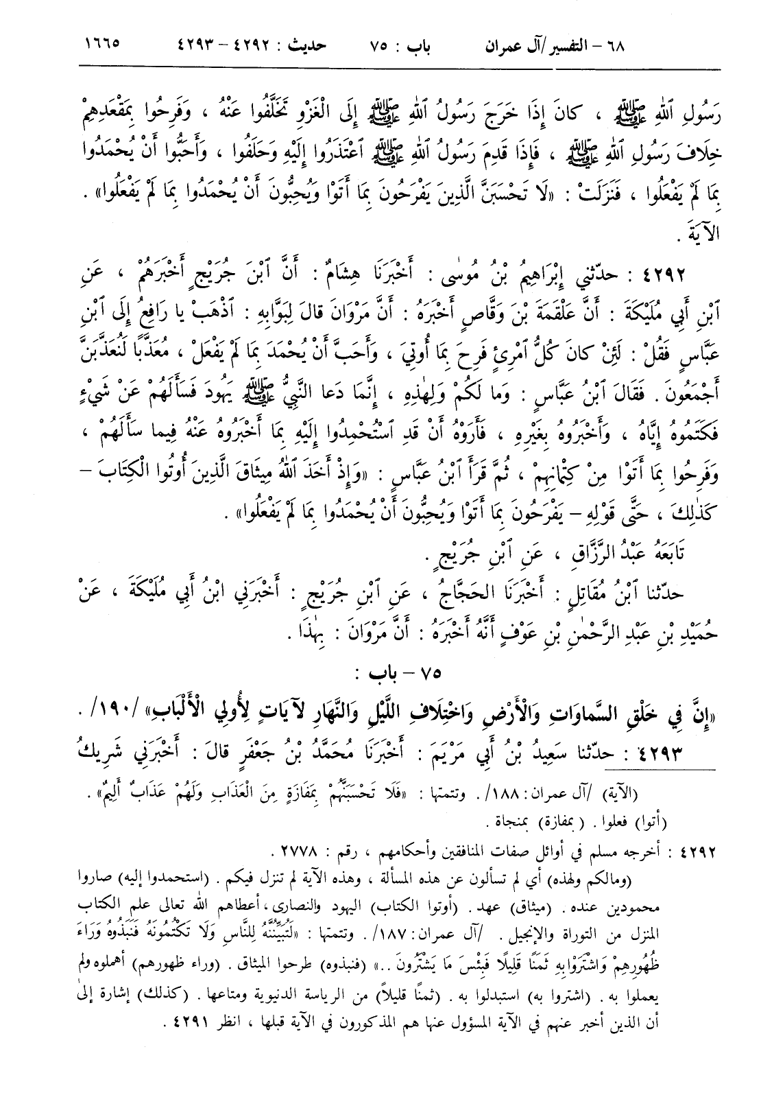 : أن مروان قال لبوابة اذهب يا رافع إلى ابن عباس فقل لئن كان كل امرئ فرح بما أوتي وأحب أن يحمد بما لا يفعل معذبا لنعذبن أجمعون . فقال ابن عباس وما لكم ولهذه إنما دعا النبي صلى الله عليه و سلم يهود فسألهم عن شيء فكتموه إياه وأخبروه بغيره فأروه أن قد استحمدوا إليه بما أخبروه عنه فيما سألهم وفرحوا بما أتوا من كتمانهم ثم قرأ ابن عباس { وإذ أخذ الله ميثاق الذين أتوا الكتاب - كذلك حتى قوله - يفرحون بما أتوا ويحبون أن يحمدوا بما لم يفعلوا }