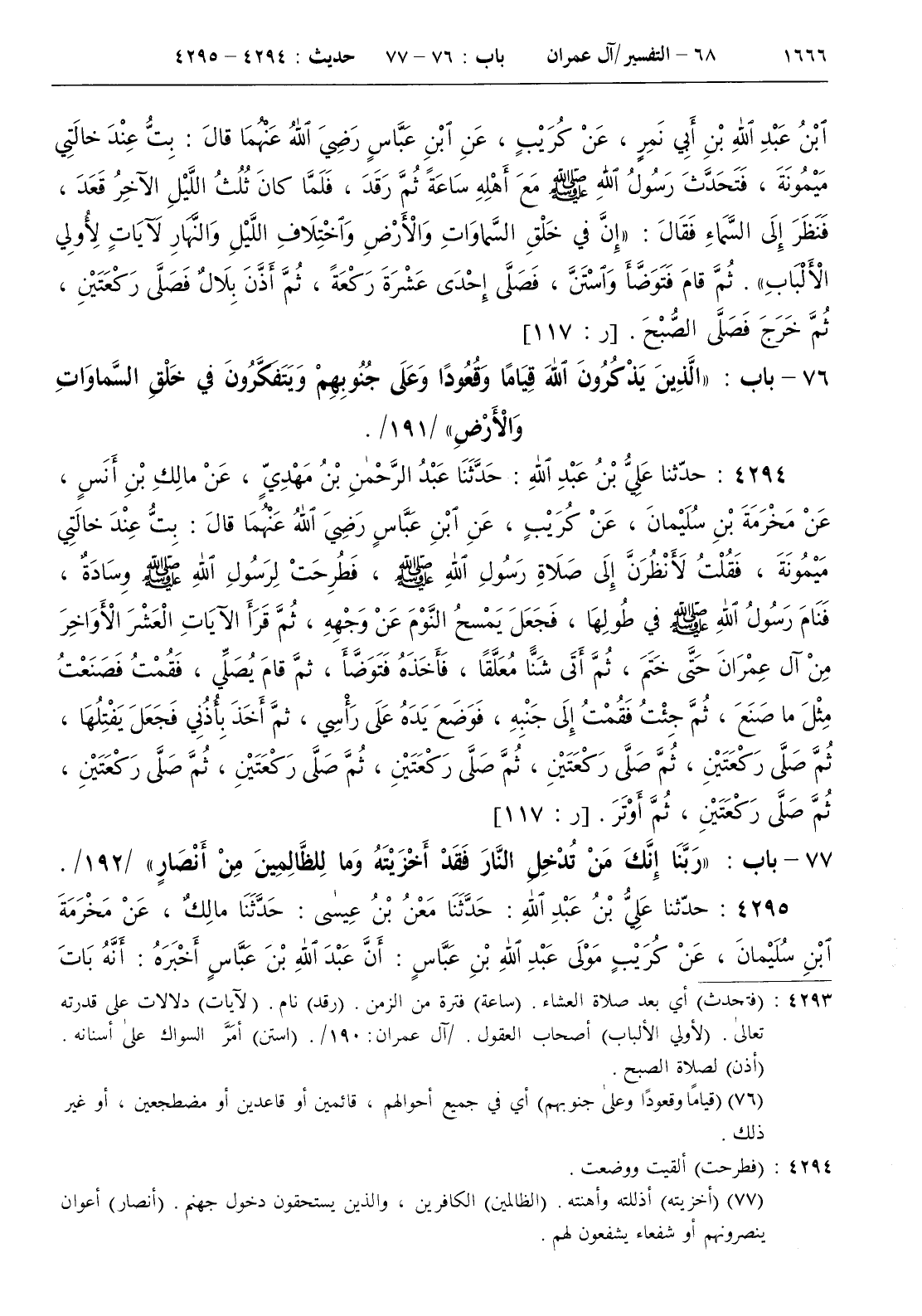 : أنه بات عند ميمونة زوج النبي صلى الله عليه و سلم وهي خالته قال فاضطجعت في عرض الوسادة واضطجع رسول الله صلى الله عليه و سلم وأهله في طولها فنام رسول الله صلى الله عليه و سلم حتى انتصف الليل أو قبله بقليل أو بعده بقليل ثم استيقظ رسول الله صلى الله عليه و سلم فجعل يمسح النوم عن وجهه بيديه ثم قرأ العشر الآيات الخواتم من سورة آل عمران ثم قام إلى شن معلقة فتوضأ منها فأحسن وضوءه ثم قام يصلي فصنعت مثل ما صنع ثم ذهبت فقمت إلى جنبه فوضع رسول الله صلى الله عليه و سلم يده اليمنى على رأسي وأخذ بيده اليمنى يفتلها فصلى ركعتين ثم ركعتين ثم ركعتين ثم ركعتين ثم ركعتين ثم ركعتين ثم ركعتين ثم أوتر ثم اضطجع حتى جاءه المؤذن فقام فصلى ركعتين خفيفتين ثم خرج فصلى الصبح