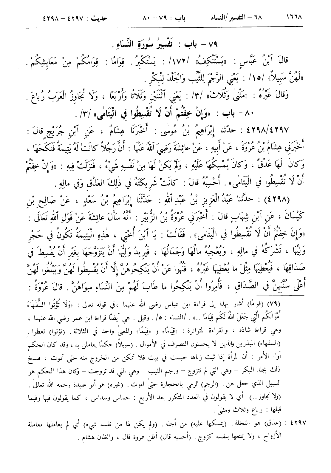 [ ش ( فليستعفف ) فلا يأكل من مال اليتيم شيئا . ( بالمعروف ) بقدر قيامه عليه وما يستحق على ذلك . ( حسيبا ) حافظا لأعمال خلقه ومحاسبهم عليها انظر 2098 وأطرافه . ( مبادرة ) أي تسرعون إلى أكل أموال اليتامى قبل بلوغهم وتسبقونهم إليها . ( أفعلنا . . ) أي قوله أعتدنا على وزن أفعلنا مشتق من العتاد وهو ما يصلح لكل ما يقع من الأمور وعدة كل شيء ]