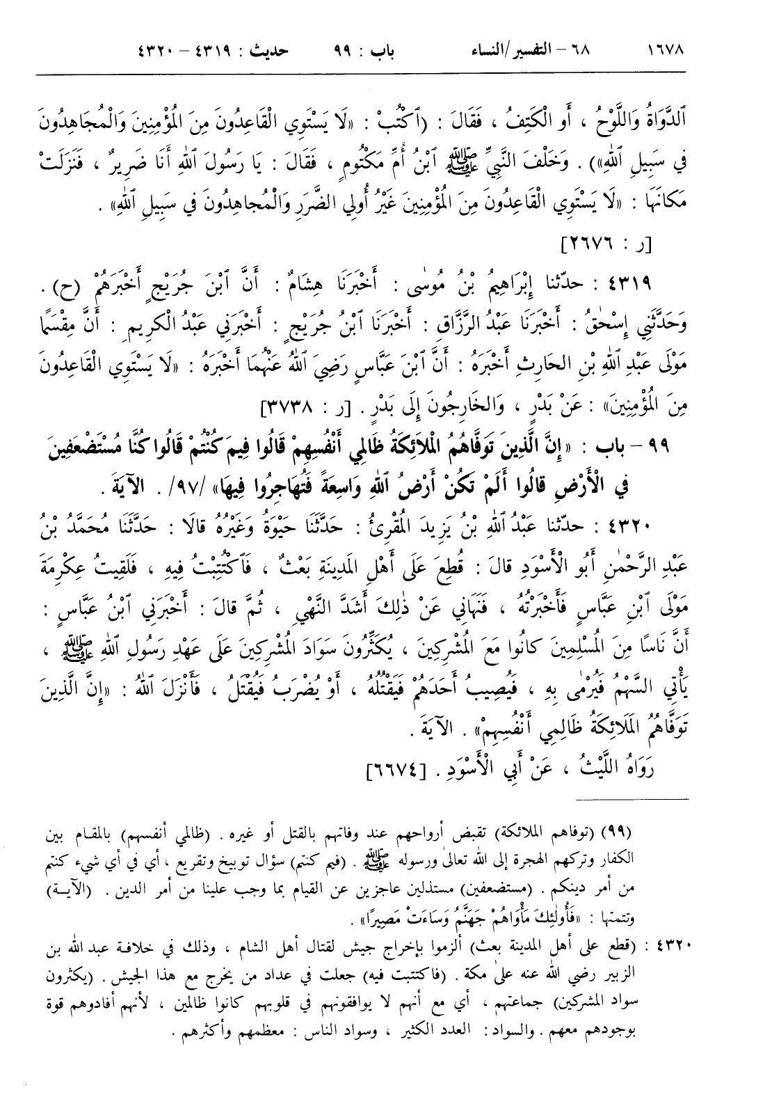 99 - باب { إن الذين توفاهم الملائكة ظالمي أنفسهم قالوا فيم كنتم قالوا كنا مستضعفين في الأرض قالوا ألم تكن أرض الله واسعة فتهاجروا فيها } / 97 / . الآية