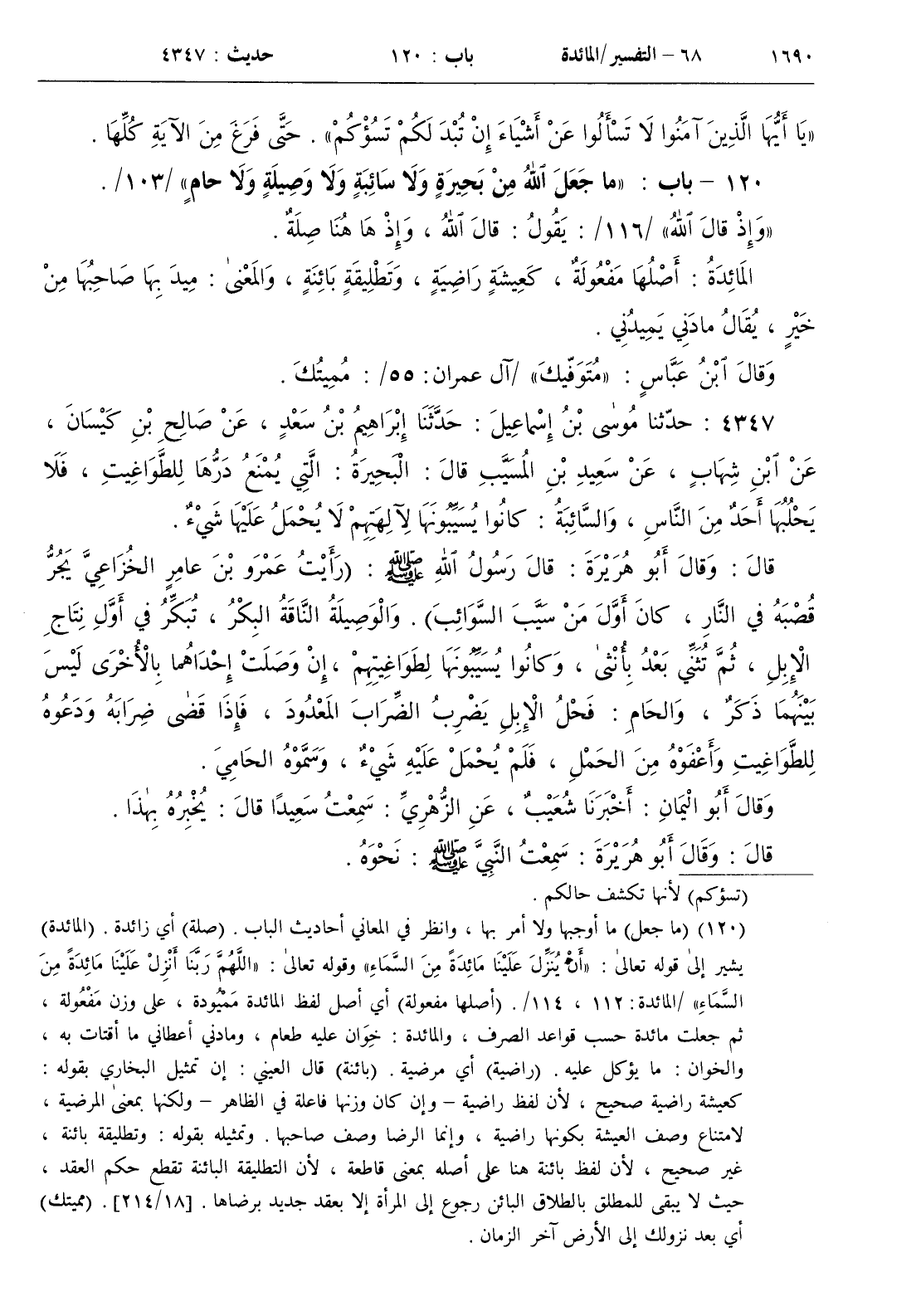 4347 - حدثنا موسى بن إسماعيل حدثنا إبراهيم بن سعد عن صالح بن كيسان عن ابن شهاب عن سعيد بن المسيب قال البحيرة التي يمنع درها للطواغيت فلا يحلبها أحد من الناس والسائبة كانوا يسيبونها لآلهتهم لا يحمل عليها شيء