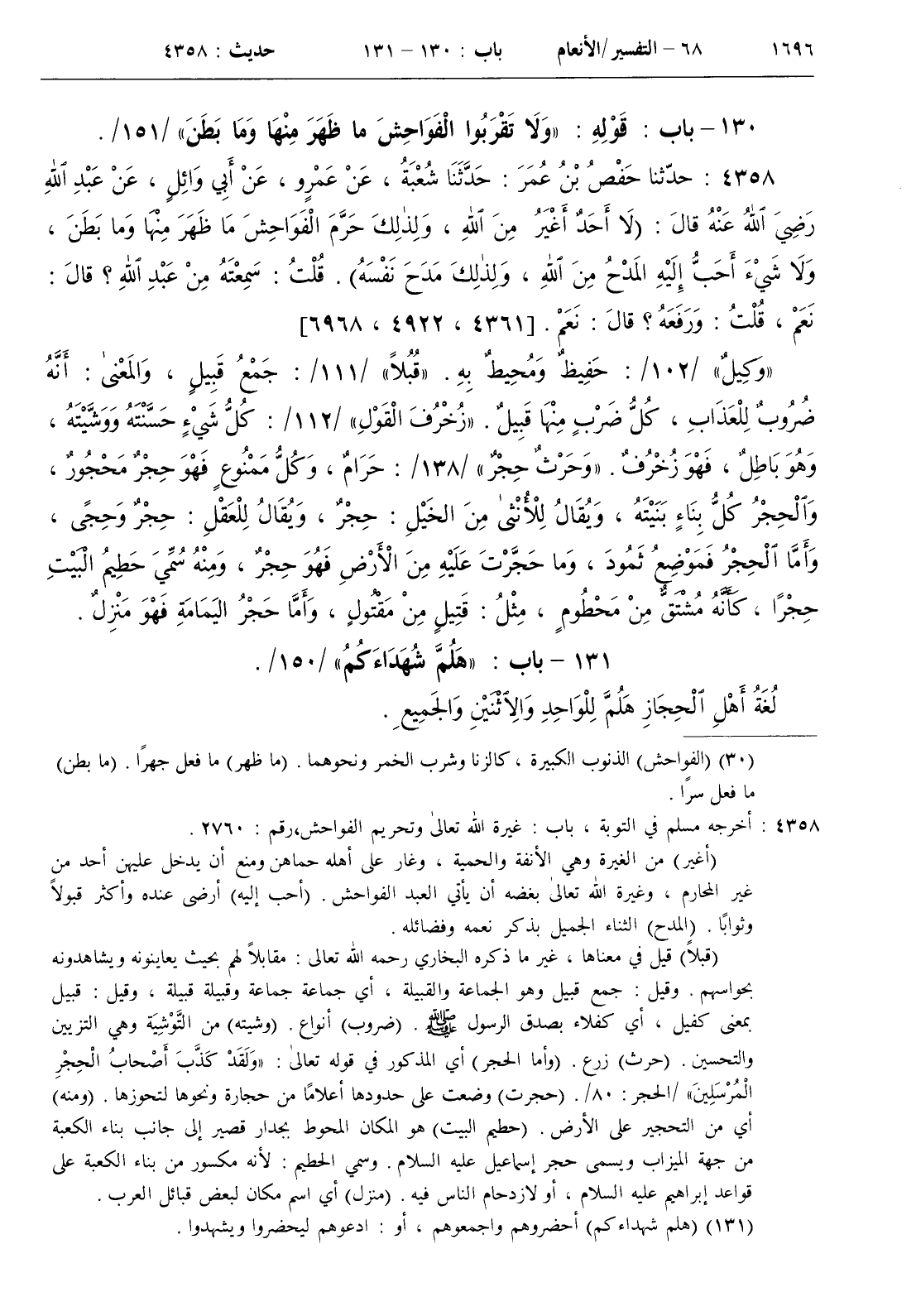 ( أغير ) من الغيرة وهي الأنفة والحمية وغار على أهله حماهن ومنع أن يدخل عليهن أحد من غير المحارم وغيرة الله تعالى بغضه أن يأتي العبد الفواحش . ( أحب إليه ) أرضى عنده وأكثر قبولا وثوابا . ( المدح ) الثناء الجميل بذكر نعمه وفضائله . ( قبلا ) قيل في معناها غير ما ذكره البخاري رحمه الله تعالى مقابلا لهم بحيث يعاينونه ويشاهدونه بحواسهم . وقيل جمع قبيل وهو الجماعة والقبيلة أي جماعة جماعة وقبيلة قبيلة وقيل قبيل بمعنى كفيل أي كفلاء بصدق الرسول صلى الله عليه و سلم . ( ضروب ) أنواع . ( وشيته ) من التوشية وهي التزيين والتحسين . ( حرث ) زرع . ( وأما الحجر ) أي المذكور في قوله تعالى { ولقد كذب أصحاب الحجر المرسلين } / الحجر 80 / . ( حجرت ) وضعت على حدودها أعلاما من حجارة ونحوها لتحوزها . ( ومنه ) أي من التحجير على الأرض . ( حطيم البيت ) هو المكان المحوط بجدار قصير إلى جانب بناء الكعبة من جهة الميزاب ويسمى حجر إسماعيل عليه السلام . وسمي الحطيم لأنه مكسور من بناء الكعبة على قواعد إبراهيم عليه السلام أو لازدحام الناس فيه . ( منزل ) أي اسم مكان لبعض قبائل العرب ]