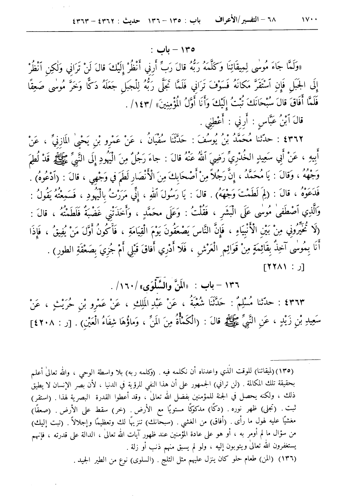 137 - باب { قل يا أيها الناس إني رسول الله إليكم جميعا الذي له ملك السموات والأرض لا إله إلا هو يحيي ويميت فآمنوا بالله ورسوله النبي الأمي الذي يؤمن بالله وكلماته واتبعوه لعلكم تهتدون } / 158 /