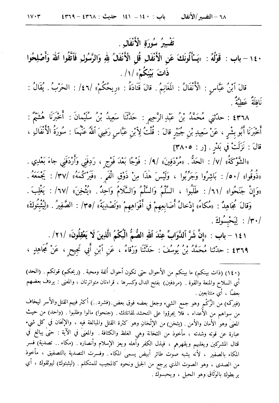 [ ش ( ذات بينكم ) ما بينكم من الأحوال حتى تكون أحوال ألفة ومحبة . ( ريحكم ) قوتكم . ( الحد ) أي السلاح والمنعة والقوة . ( مردفين ) بفتح الدال وكسرها قراءتان متواترتان والمعنى يردف بعضكم بعضا أي متتابعين . ( فيركمه ) من الركم وهو جمع الشيء وجعل بعضه فوق بعض . ( فشرد . . ) أكثر فيهم القتل والأسر ليخاف من سواهم من الأعداء فلا يجرؤوا على التحشد لمقاتلتك . ( جنحوا ) مالوا وطلبوا . ( واحد ) من حيث المعنى وهو الأمان والأمن . ( يثخن ) من الإثخان وهو كثرة القتل والمبالغة فيه والإثخان في كل شيء عبارة عن قوته وشدته مأخوذ من الثخانة وهي الغلظ والكثافة . والمعنى في الآية حتى يبلغ في قتال المشركين ويغلبهم ويقهرهم فيذل الكفر وأهله ويعز الإسلام وأنصاره . ( مكاء . . تصدية ) فسر المكاء بالصفير لأنه يشبه صوت طائر أبيض يسمى المكاء . وفسرت التصدية بالتصفيق مأخوذ من الصدى وهو الصوت الذي يرجع من الجبل ونحوه كالمجيب للمتكلم . ( ليثبتوك ) ليوثقوك أي يربطوك بالوثاق وهو الحبل ويحبسوك ]